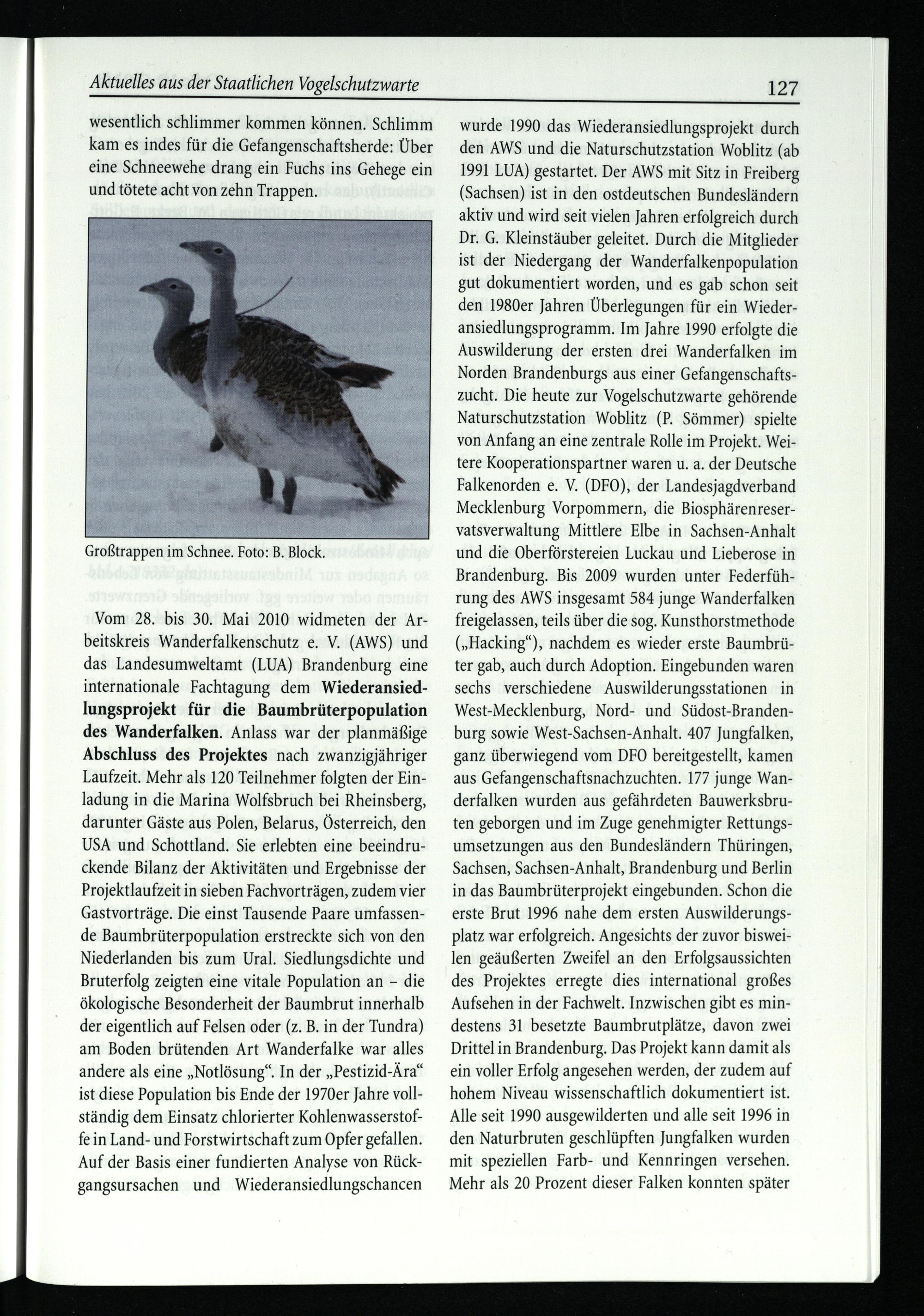 Vom 28. bis 30. Mai 2010 widmeten der Ar­beitskreis Wanderfalkenschutz e. V.(AWS) und das Landesumweltamt(LUA) Brandenburg eine internationale Fachtagung dem Wiederansied­lungsprojekt für die Baumbrüterpopulation des Wanderfalken. Anlass war der planmäßige Abschluss des Projektes nach zwanzigjähriger Laufzeit. Mehr als 120 Teilnehmer folgten der Ein­ladung in die Marina Wolfsbruch bei Rheinsberg , darunter Gäste aus Polen , Belarus , Österreich , den USA und Schottland . Sie erlebten eine beeindru­ckende Bilanz der Aktivitäten und Ergebnisse der Projektlaufzeit in sieben Fachvorträgen, zudem vier Gastvorträge. Die einst Tausende Paare umfassen­de Baumbrüterpopulation erstreckte sich von den Niederlanden bis zum Ural . Siedlungsdichte und Bruterfolg zeigten eine vitale Population an- die ökologische Besonderheit der Baumbrut innerhalb der eigentlich auf Felsen oder(z. B. in der Tundra) am Boden brütenden Art Wanderfalke war alles andere als eineNotlösung. In derPestizid-Ära ist diese Population bis Ende der 1970er Jahre voll­ständig dem Einsatz chlorierter Kohlenwasserstof­fe in Land- und Forstwirtschaft zum Opfer gefallen. Auf der Basis einer fundierten Analyse von Rück­gangsursachen und Wiederansiedlungschancen