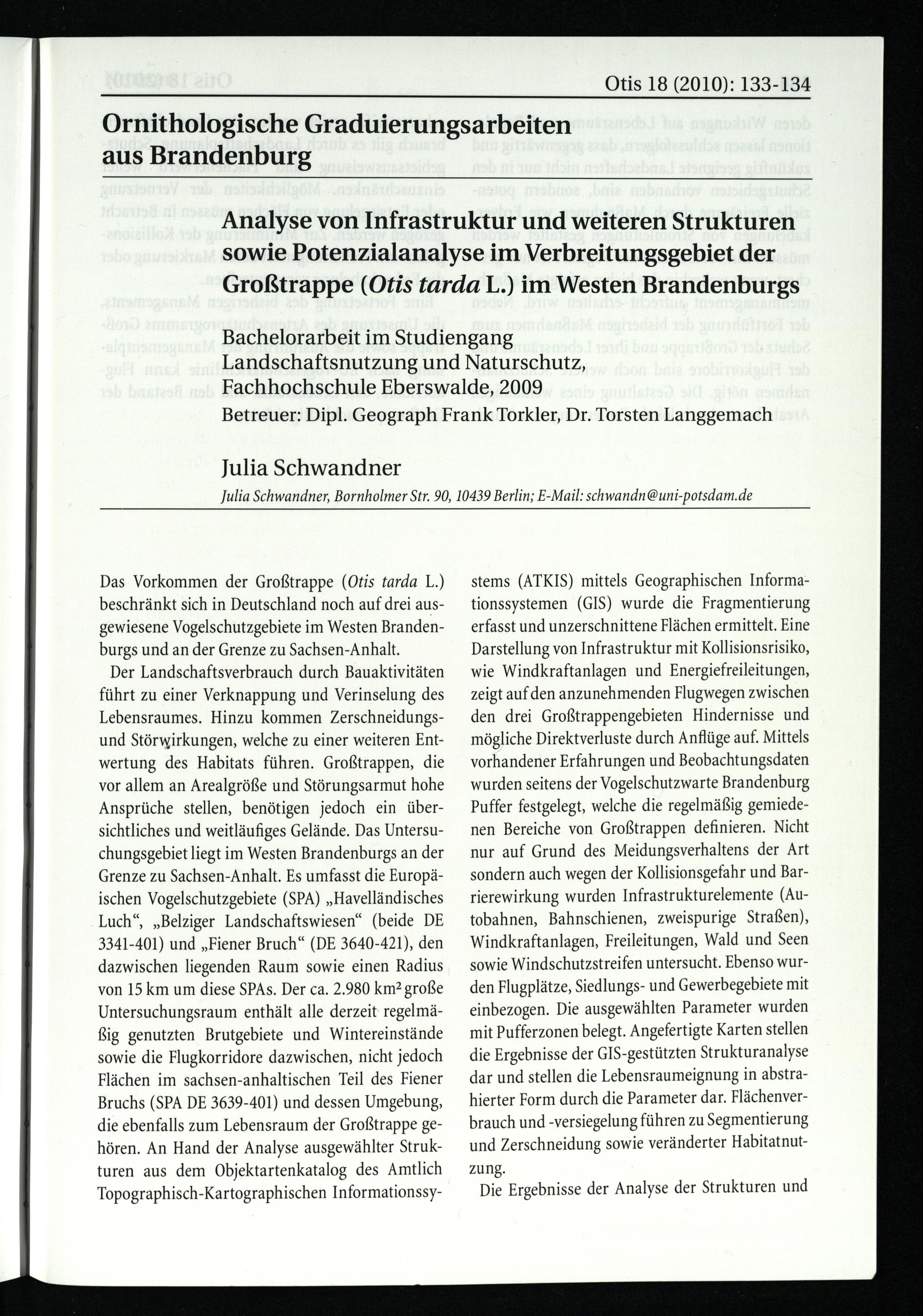 stems(ATKIS) mittels Geographischen Informationssystemen(GIS ) wurde die Fragmentierung erfasst und unzerschnittene Flächen ermittelt. Eine Darstellung von Infrastruktur mit Kollisionsrisiko, wie Windkraftanlagen und Energiefreileitungen, zeigt auf den anzunehmenden Flugwegen zwischen den drei Großtrappengebieten Hindernisse und mögliche Direktverluste durch Anflüge auf. Mittels vorhandener Erfahrungen und Beobachtungsdaten wurden seitens der Vogelschutzwarte Brandenburg Puffer festgelegt, welche die regelmäßig gemiedenen Bereiche von Großtrappen definieren. Nicht nur auf Grund des Meidungsverhaltens der Art sondern auch wegen der Kollisionsgefahr und Barrierewirkung wurden Infrastrukturelemente(Autobahnen, Bahnschienen, zweispurige Straßen), Windkraftanlagen, Freileitungen, Wald und Seen sowie Windschutzstreifen untersucht. Ebenso wurden Flugplätze, Siedlungs- und Gewerbegebiete mit einbezogen. Die ausgewählten Parameter wurden mit Pufferzonen belegt. Angefertigte Karten stellen die Ergebnisse der GIS -gestützten Strukturanalyse dar und stellen die Lebensraumeignung in abstrahierter Form durch die Parameter dar. Flächenverbrauch und-versiegelung führen zu Segmentierung und Zerschneidung sowie veränderter Habitatnutzung.