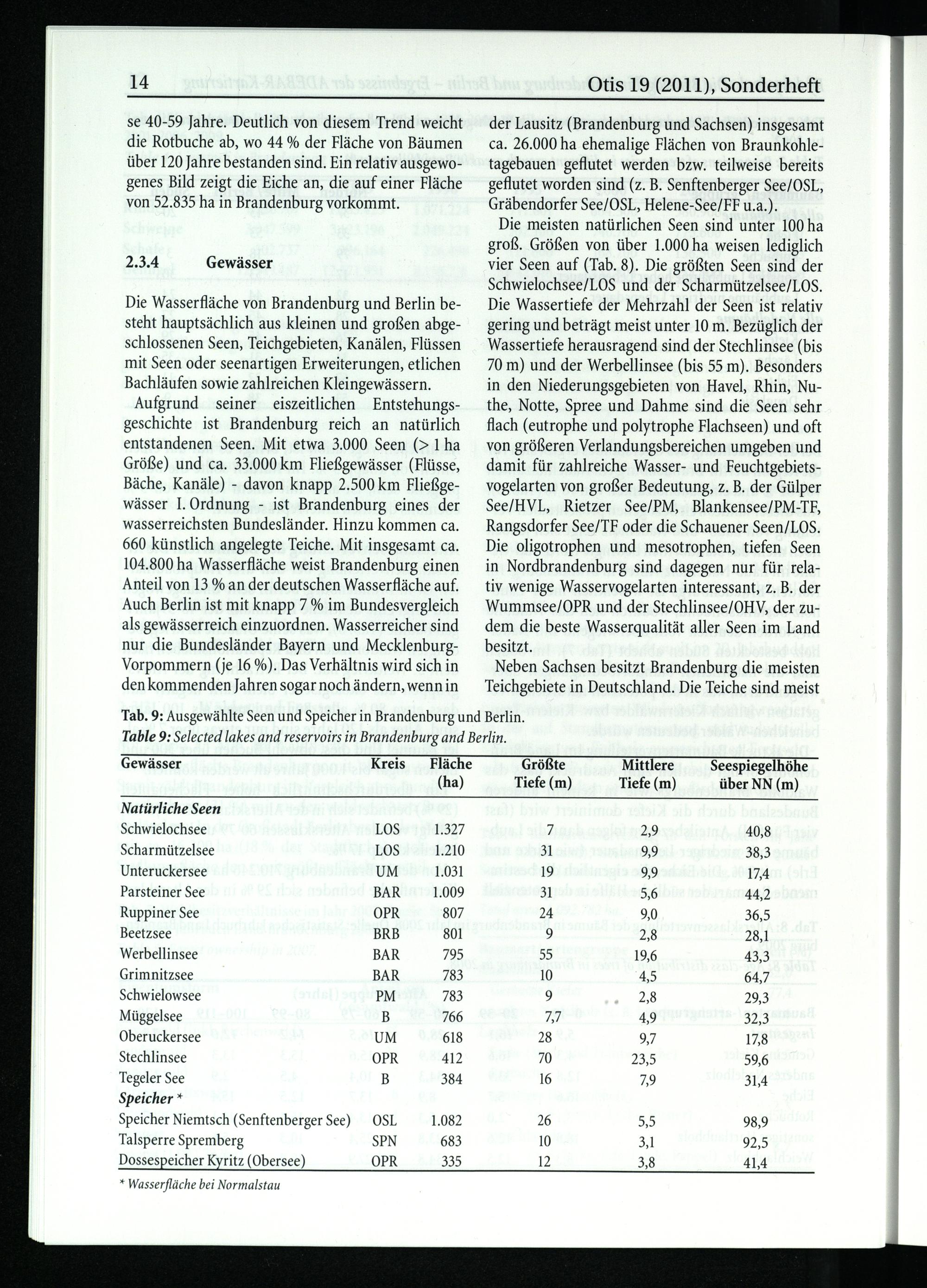Tab. 9: Ausgewählte Seen und Speicher in Brandenburg und Berlin . Table 9: Selected lakes and reservoirs in Brandenburg and Berlin .