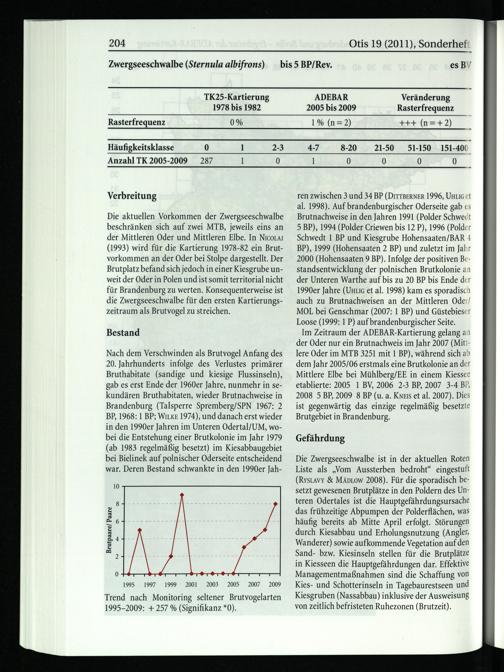 ren zwischen 3 und 34 BP(DITTBERNER 1996, UHLIG et al. 1998). Auf brandenburgischer Oderseite gab es Brutnachweise in den Jahren 1991(Polder Schwect 5 BP), 1994(Polder Criewen bis 12 P), 1996(Polder Schwedt 1 BP und Kiesgrube Hohensaaten/BAR 4 BP), 1999(Hohensaaten 2 BP) und zuletzt im Jahr 2000(Hohensaaten 9 BP). Infolge der positiven Bestandsentwicklung der polnischen Brutkolonie an der Unteren Warthe auf bis zu 20 BP bis Ende der 1990er Jahre(UH11G6 et al. 1998) kam es sporadisch auch zu Brutnachweisen an der Mittleren Oder / MOL bei Genschmar(2007: 1 BP) und Güstebieser Loose(1999: 1 P) auf brandenburgischer Seite.