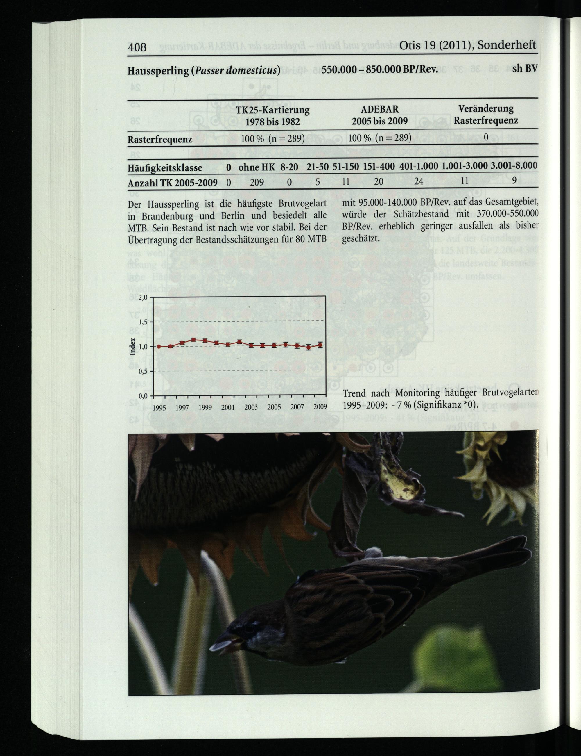 Der Haussperling ist die häufigste Brutvogelart in Brandenburg und Berlin und besiedelt alle MTB. Sein Bestand ist nach wie vor stabil. Bei der Übertragung der Bestandsschätzungen für 80 MTB