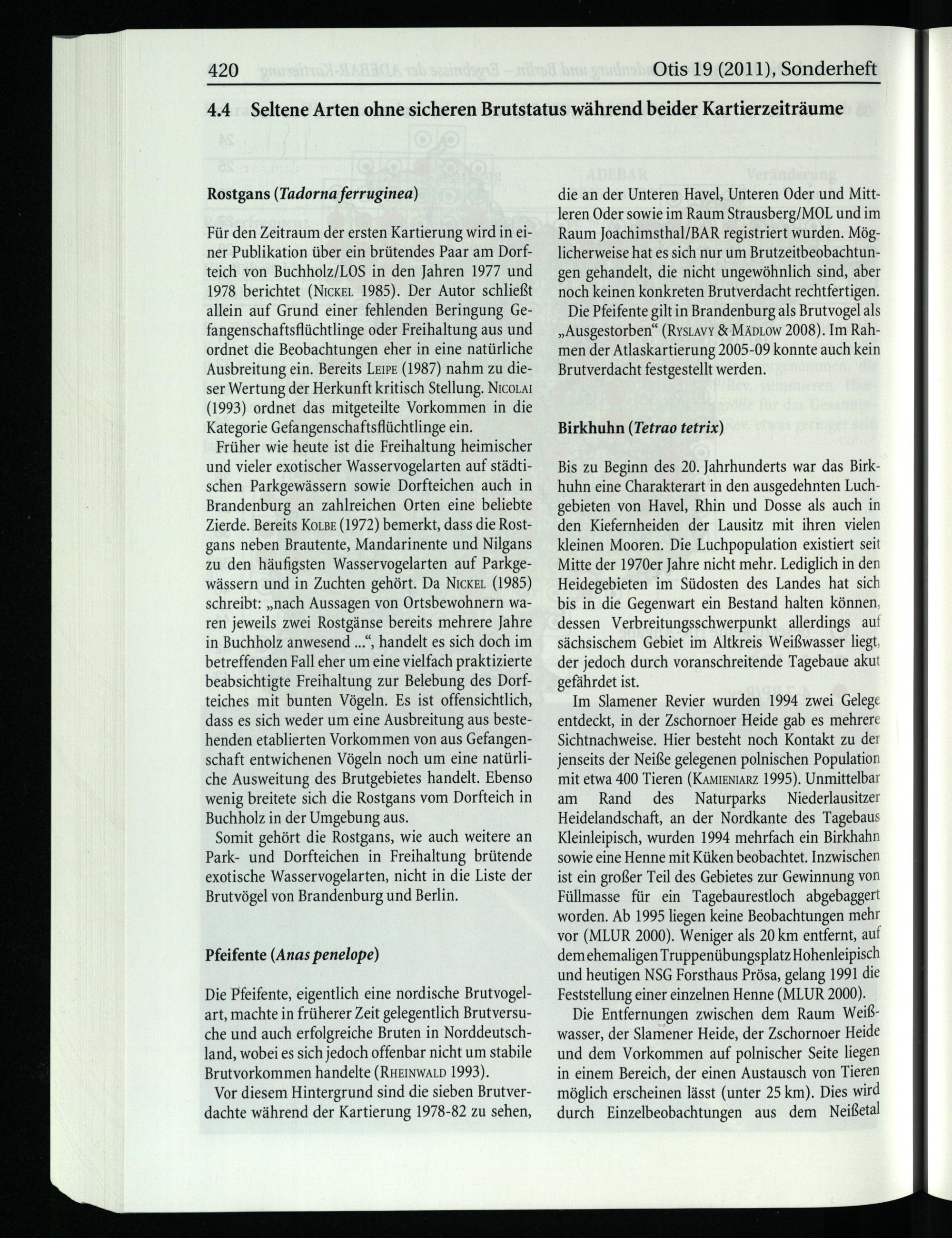 Für den Zeitraum der ersten Kartierung wird in einer Publikation über ein brütendes Paar am Dorfteich von Buchholz/LOS in den Jahren 1977 und 1978 berichtet(Nıcker. 1985). Der Autor schließt allein auf Grund einer fehlenden Beringung Gefangenschaftsflüchtlinge oder Freihaltung aus und ordnet die Beobachtungen eher in eine natürliche Ausbreitung ein. Bereits LEır:(1987) nahm zu dieser Wertung der Herkunft kritisch Stellung. NıcoLAı (1993) ordnet das mitgeteilte Vorkommen in die Kategorie Gefangenschaftsflüchtlinge ein.