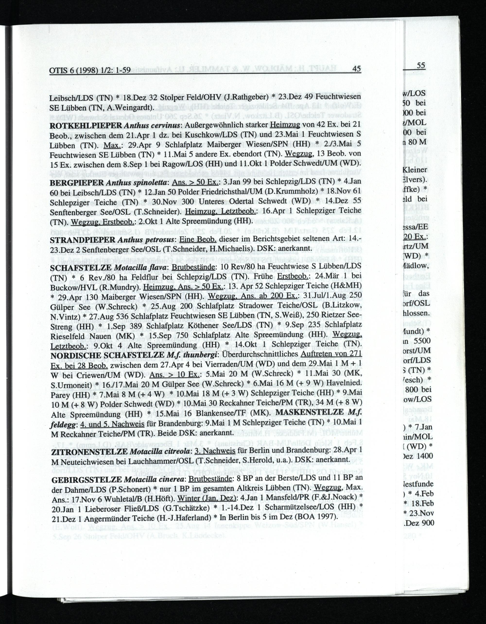 BERGPIEPER Anthus spinoletta: Ans.> 50 Ex.: 3.Jan 99 bei Schlepzig/LDS (TN)* 4.Jan 60 bei Leibsch/LDS (TN)* 12.Jan 50 Polder Friedrichsthal/UM(D.Krummholz)* 18.Nov 61 Schlepziger Teiche(TN)* 30.Nov 300 Unteres Odertal Schwedt (WD)* 14.Dez 55 Senftenberger See/OSL (T.Schneider). Heimzug, Letztbeob.: 16.Apr 1 Schlepziger Teiche (TN). Wegzug, Erstbeob.: 2.Okt 1 Alte Spreemündung(HB).
