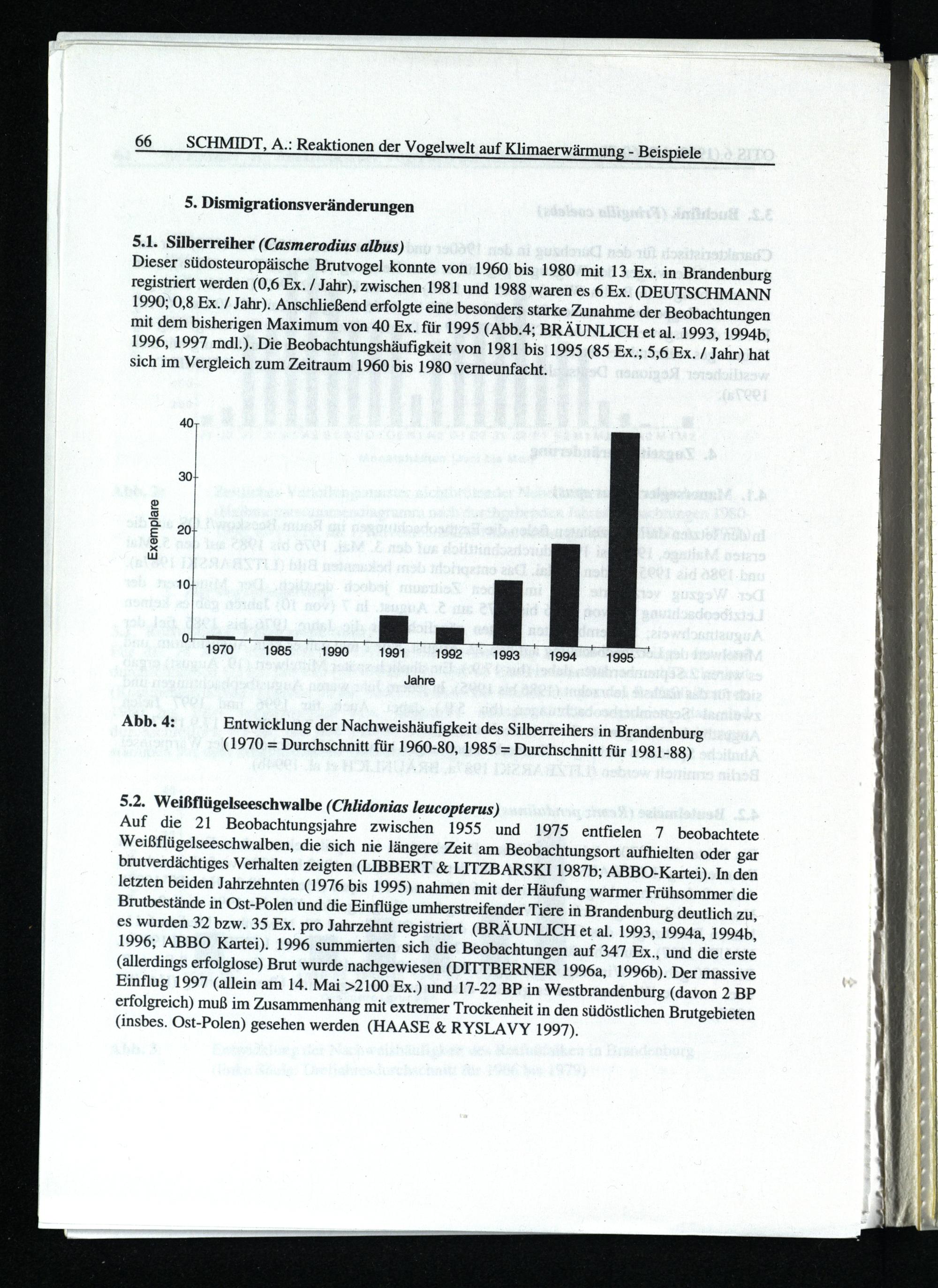 Auf die 21 Beobachtungsjahre zwischen 1955 und 1975 entfielen 7 beobachtete Weißflügelseeschwalben, die sich nie längere Zeit am Beobachtungsort aufhielten oder gar brutverdächtiges Verhalten zeigten(LIBBERT& LITZBARSKI 1987b; ABBO-Kartei). In den letzten beiden Jahrzehnten(1976 bis 1995) nahmen mit der Häufung warmer Frühsommer die Brutbestände in Ost-Polen und die Einflüge umherstreifender Tiere in Brandenburg deutlich zu, es wurden 32 bzw. 35 Ex. pro Jahrzehnt registriert(BRÄUNLICH et al. 1993, 1994a, 1994b, 1996; ABBO Kartei). 1996 summierten sich die Beobachtungen auf 347 Ex., und die erste (allerdings erfolglose) Brut wurde nachgewiesen(DITTBERNER 1996a, 1996b). Der massive Einflug 1997(allein am 14. Mai>2100 Ex.) und 17-22 BP in Westbrandenburg(davon 2 BP erfolgreich) muß im Zusammenhang mit extremer Trockenheit in den südöstlichen Brutgebieten (insbes. Ost-Polen) gesehen werden(HAASE& RYSLAVY 1997).