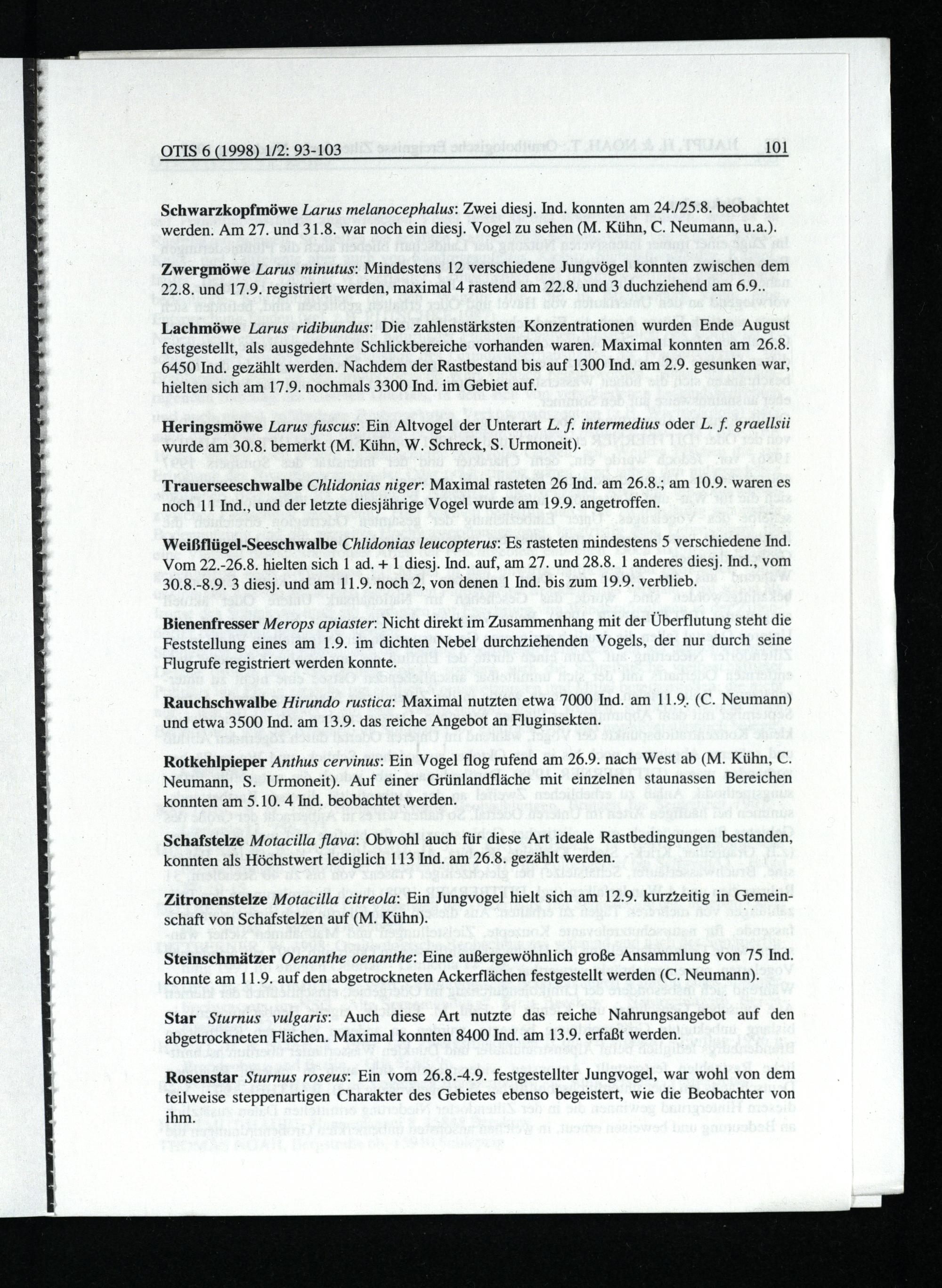 Lachmöwe Larus ridibundus : Die zahlenstärksten Konzentrationen wurden Ende August festgestellt, als ausgedehnte Schlickbereiche vorhanden waren. Maximal konnten am 26.8. 6450 Ind. gezählt werden. Nachdem der Rastbestand bis auf 1300 Ind . am 2.9. gesunken war, hielten sich am 17.9. nochmals 3300 Ind. im Gebiet auf.