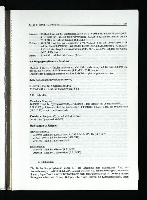 Januar: 03.01.98 1 ad. Ind. bei Güstebieser Loose; 04.-11.01.98 1 ad. Ind. bei Gieshof(M.F., S.F.); 12.01.98 1ad. Ind. bei Sydowswiese; 15.01.98 1 ad. Ind. bei Gieshof(M.F.); 23.01.98 2 ad. Ind. bei Golzow(S.F.,S.F.) 04.02.98 1 ad. Ind. bei Gorgast(S.F.); 01.-09.02.98 1 ad. Ind., 09./10.02.98 3 ad. Ind. bei Gieshof; 09.02.98 1 ad. Ind. bei Bleyen(M.F.,S.F., H.Schenke); 17.-21.02.98 5 ad. Ind.(im Trupp) bei Sydowswiese(S.F., M.F.), 22.02.98 1 ad. Ind. bei Kienitz (M.F., T.Förder)