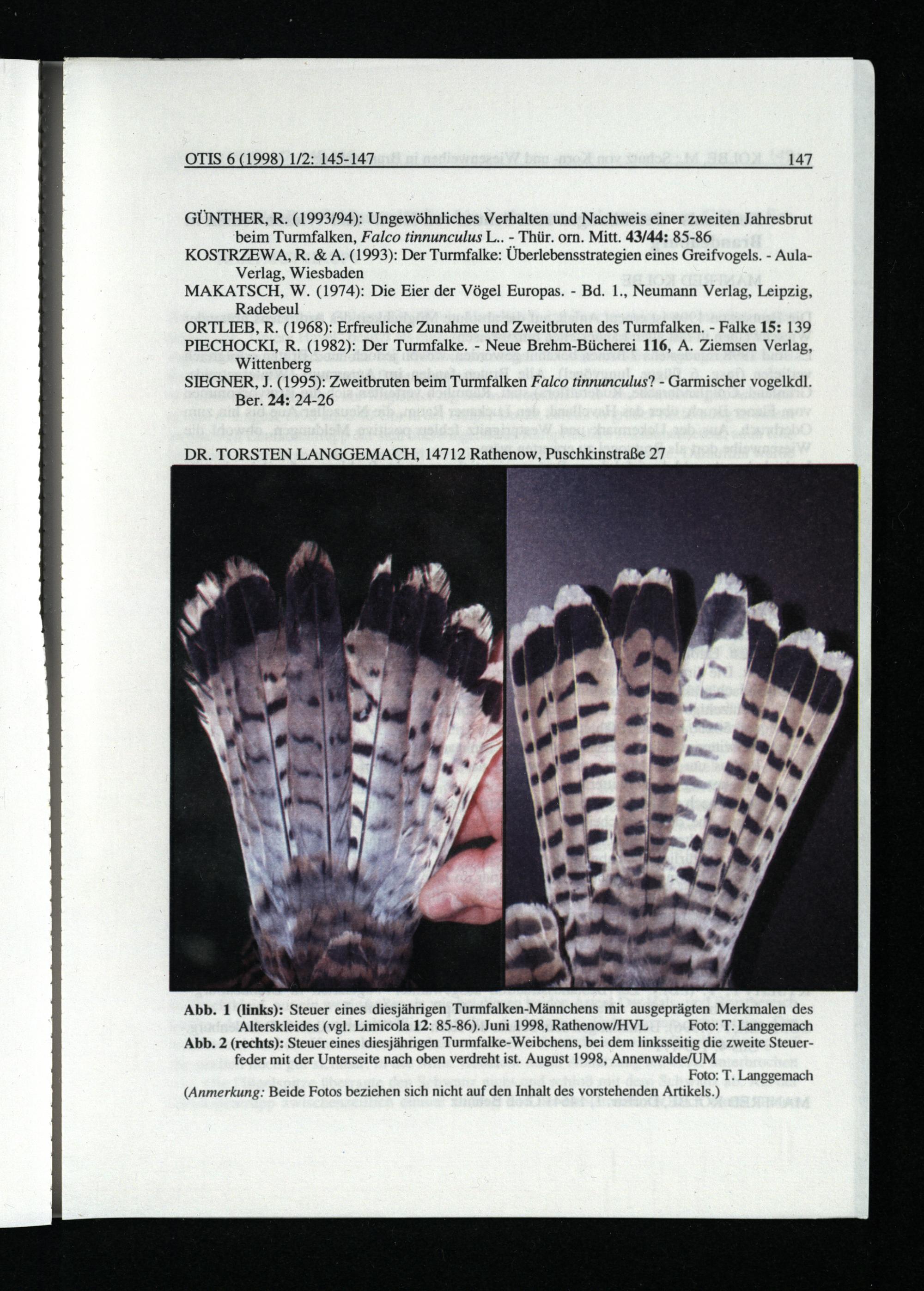 Abb. 1(links): Steuer eines diesjährigen Turmfalken-Männchens mit ausgeprägten Merkmalen des Alterskleides(vgl. Limicola 12: 85-86). Juni 1998, Rathenow/HVL Foto: T. Langgemach Abb. 2(rechts): Steuer eines diesjährigen Turmfalke-Weibchens, bei dem linksseitig die zweite Steuerfeder mit der Unterseite nach oben verdreht ist. August 1998, Annenwalde/UM Foto: T. Langgemach (Anmerkung: Beide Fotos beziehen sich nicht auf den Inhalt des vorstehenden Artikels.)