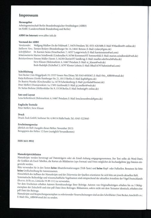 Herausgeber Arbeitsgemeinschaft Berlin-Brandenburgischer Ornithologen(ABBO) im NABU (Landesverbände Brandenburg und Berlin )