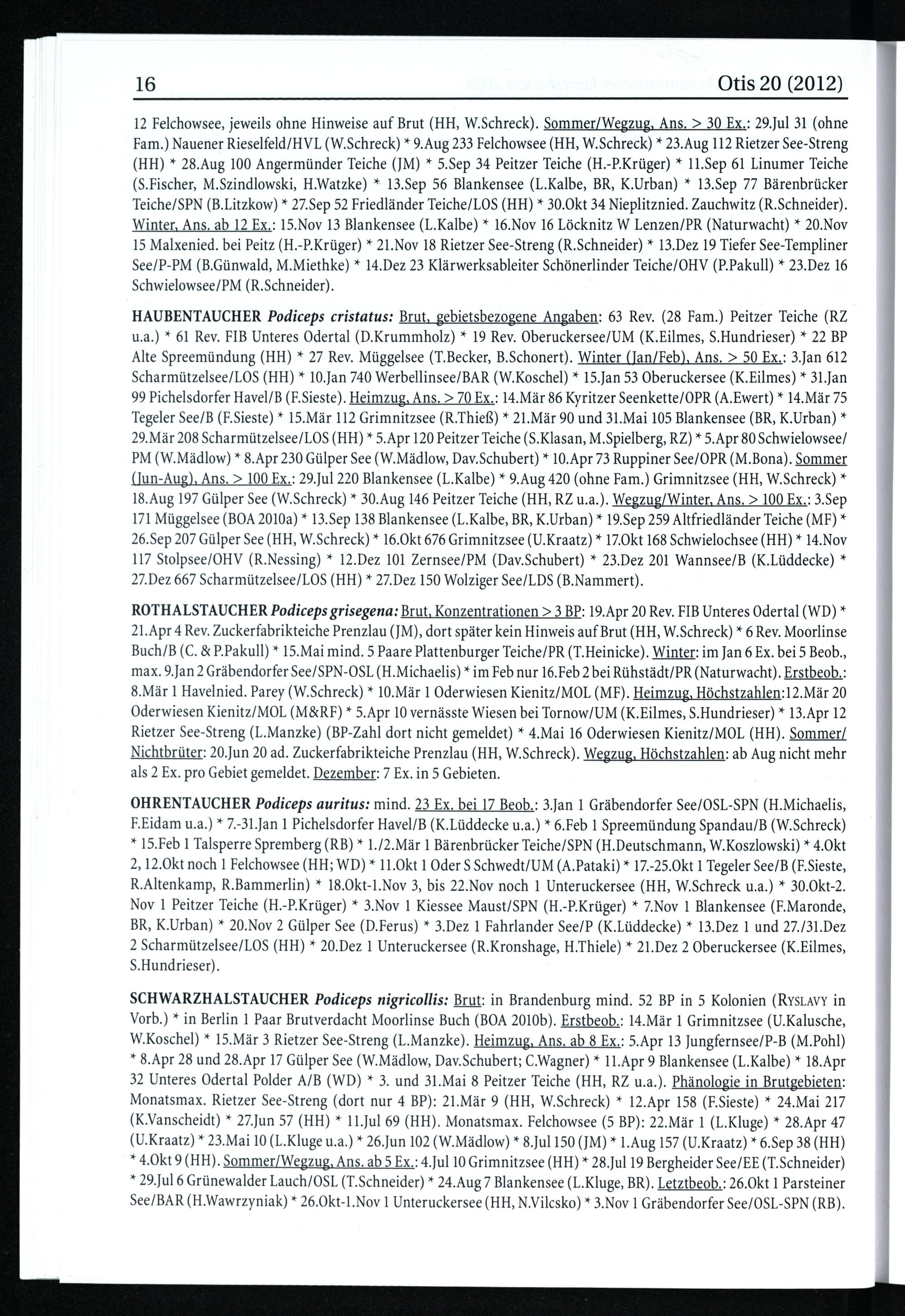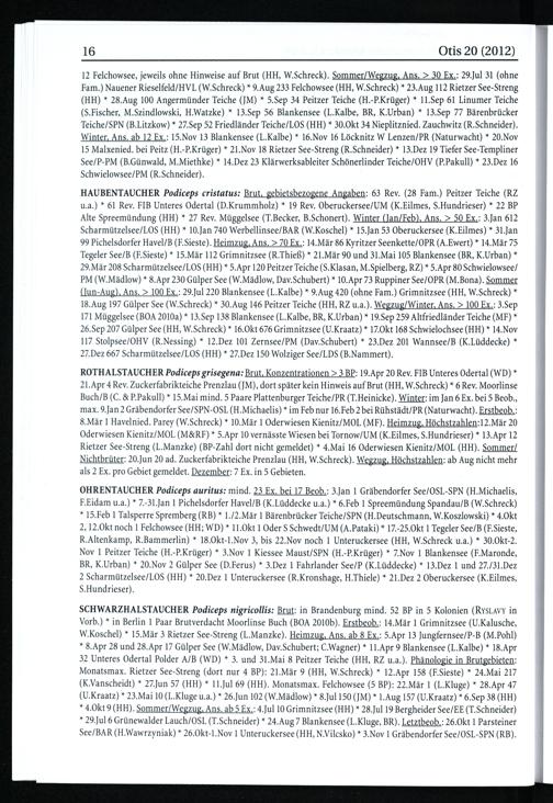 HAUBENTAUCHER Podiceps cristatus: Brut, gebietsbezogene Angaben: 63 Rev.(28 Fam.) Peitzer Teiche(RZ u.a.)* 61 Rev. FIB Unteres Odertal(D.Krummholz)* 19 Rev. Oberuckersee/UM (K.Eilmes, S.Hundrieser)* 22 BP Alte Spreemündung(HH )* 27 Rev. Müggelsee(T.Becker, B.Schonert). Winter(Jan/Feb), Ans.> 50 Ex.: 3.Jan 612 Scharmützelsee/LOS(HH )* 10.Jan 740 Werbellinsee/BAR(W.Koschel)* 15.Jan 53 Oberuckersee(K.Eilmes)* 31.Jan 99 Pichelsdorfer Havel/B (F.Sieste). Heimzug, Ans.> 70 Ex.: 14.Mär 86 Kyritzer Seenkette/OPR (A.Ewert)* 14.Mär 75 Tegeler See/B(F.Sieste)* 15.Mär 112 Grimnitzsee(R.Thieß)* 21.Mär 90 und 31.Mai 105 Blankensee(BR , K.Urban)* 29.Mär 208 Scharmützelsee/LOS(HH )* 5.Apr 120 Peitzer Teiche(S.Klasan, M.Spielberg, RZ)* 5.Apr 80 Schwielowsee/ PM(W.Mädlow)* 8.Apr 230 Gülper See(W.Mädlow, Dav.Schubert)* 10.Apr 73 Ruppiner See/OPR (M.Bona). Sommer (Jun-Aug), Ans.> 100 Ex.: 29.Jul 220 Blankensee (L.Kalbe)* 9.Aug 420(ohne Fam.) Grimnitzsee(HH , W.Schreck)* 18.Aug 197 Gülper See(W.Schreck)* 30.Aug 146 Peitzer Teiche(HH , RZ u.a.). Wegzug/Winter, Ans.> 100 Ex.: 3.Sep 171 Müggelsee(BOA 2010a)* 13.Sep 138 Blankensee(L.Kalbe, BR , K.Urban)* 19.Sep 259 Altfriedländer Teiche(MF)* 26.Sep 207 Gülper See(HH , W.Schreck)* 16.Okt 676 Grimnitzsee(U.Kraatz)* 17.Okt 168 Schwielochsee (HH )* 14.Nov 117 Stolpsee/OHV (R.Nessing)* 12.Dez 101 Zernsee/PM(Dav.Schubert)* 23.Dez 201 Wannsee/B (K.Lüddecke)* 27.Dez 667 Scharmützelsee/LOS(HH )* 27.Dez 150 Wolziger See/LDS (B.Nammert).