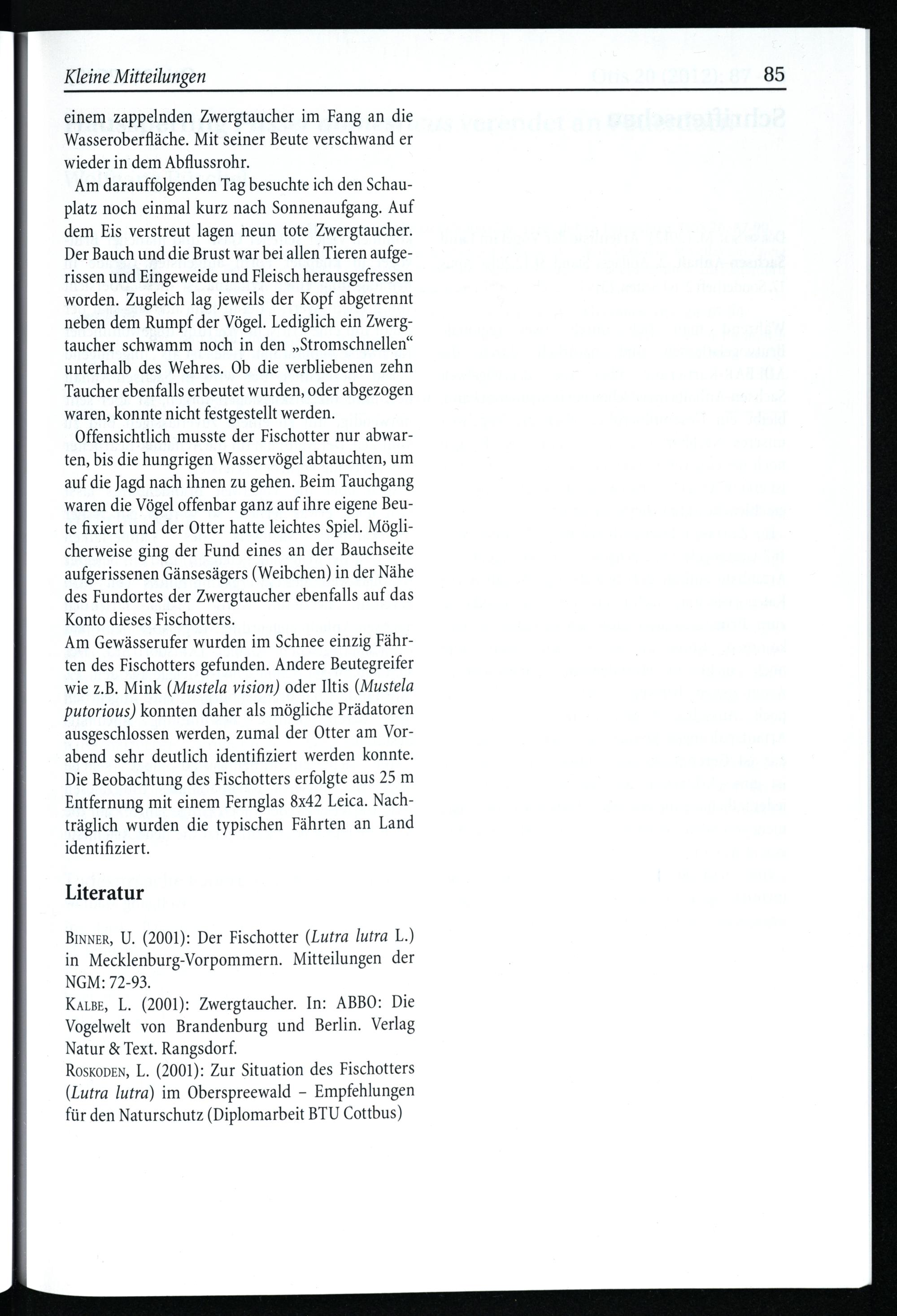 Bınner, U.(2001): Der Fischotter(Lutra lutra L.) in Mecklenburg-Vorpommern . Mitteilungen der NGM: 72-93.