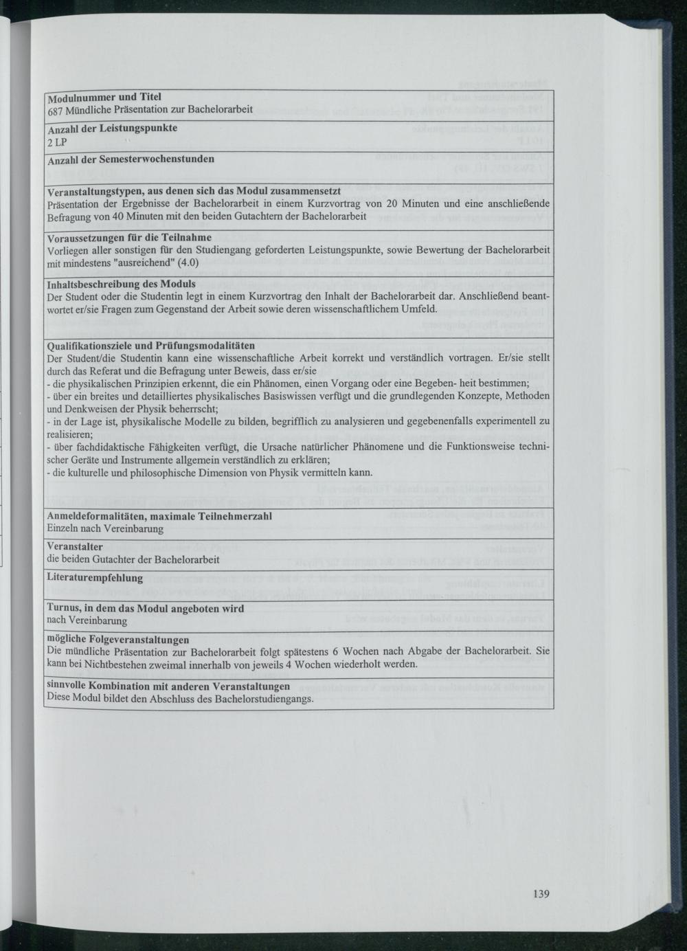 Die mündliche Präsentation zur Bachelorarbeit folgt spätestens 6 Wochen nach Abgabe der Bachelorarbeit. Sie kann bei Nichtbestehen zweimal innerhalb von jeweils 4 Wochen wiederholt werden.