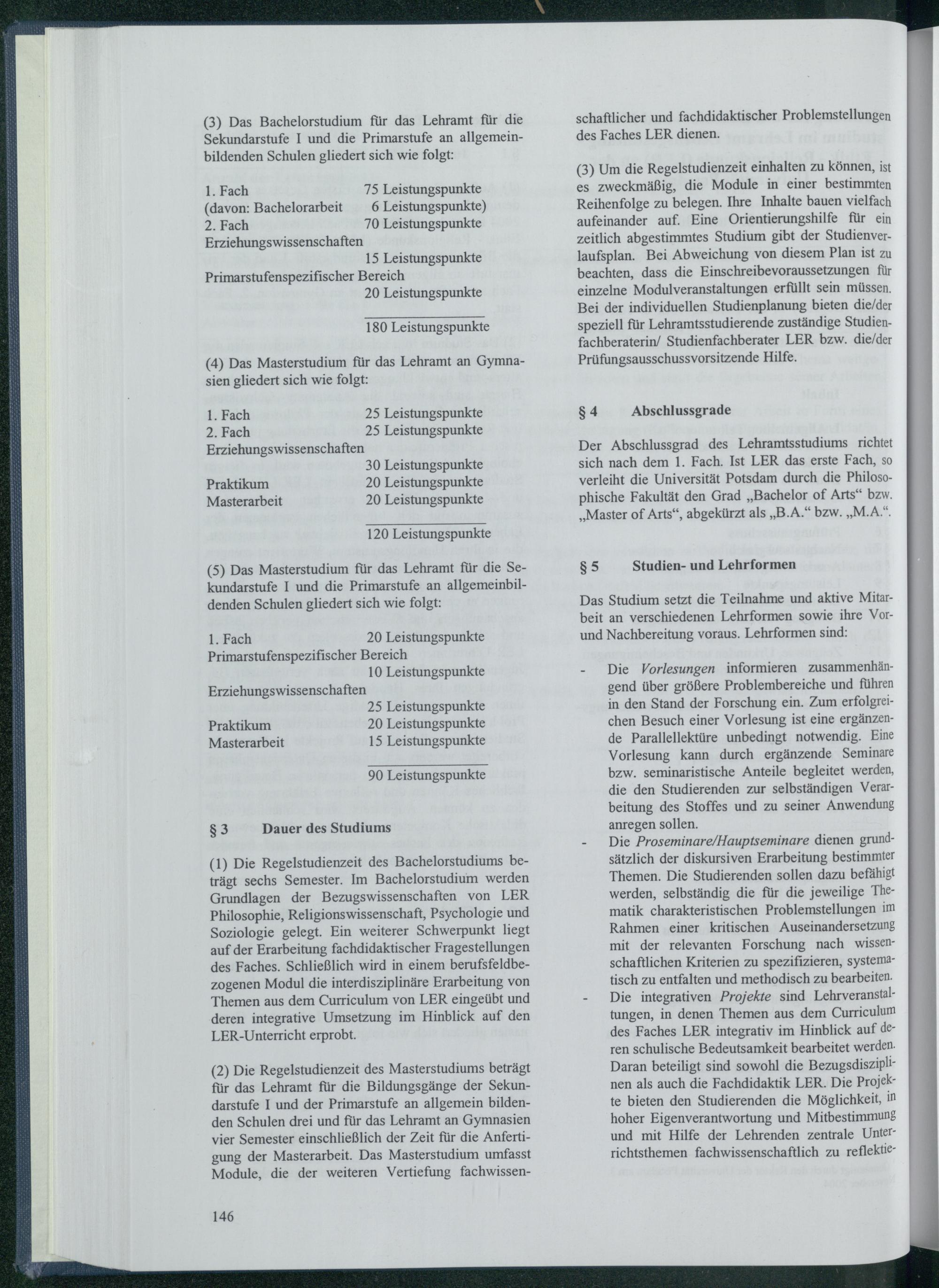 ( 1) Die Regelstudienzeit des Bachelorstudiums beträgt sechs Semester. Im Bachelorstudium werden Grundlagen der Bezugswissenschaften von LER Philosophie, Religionswissenschaft, Psychologie und Soziologie gelegt. Ein weiterer Schwerpunkt liegt auf der Erarbeitung fachdidaktischer Fragestellungen des Faches. Schließlich wird in einem berufsfeldbezogenen Modul die interdisziplinäre Erarbeitung von Themen aus dem Curriculum von LER eingeübt und deren integrative Umsetzung im Hinblick auf den LER- Unterricht erprobt.