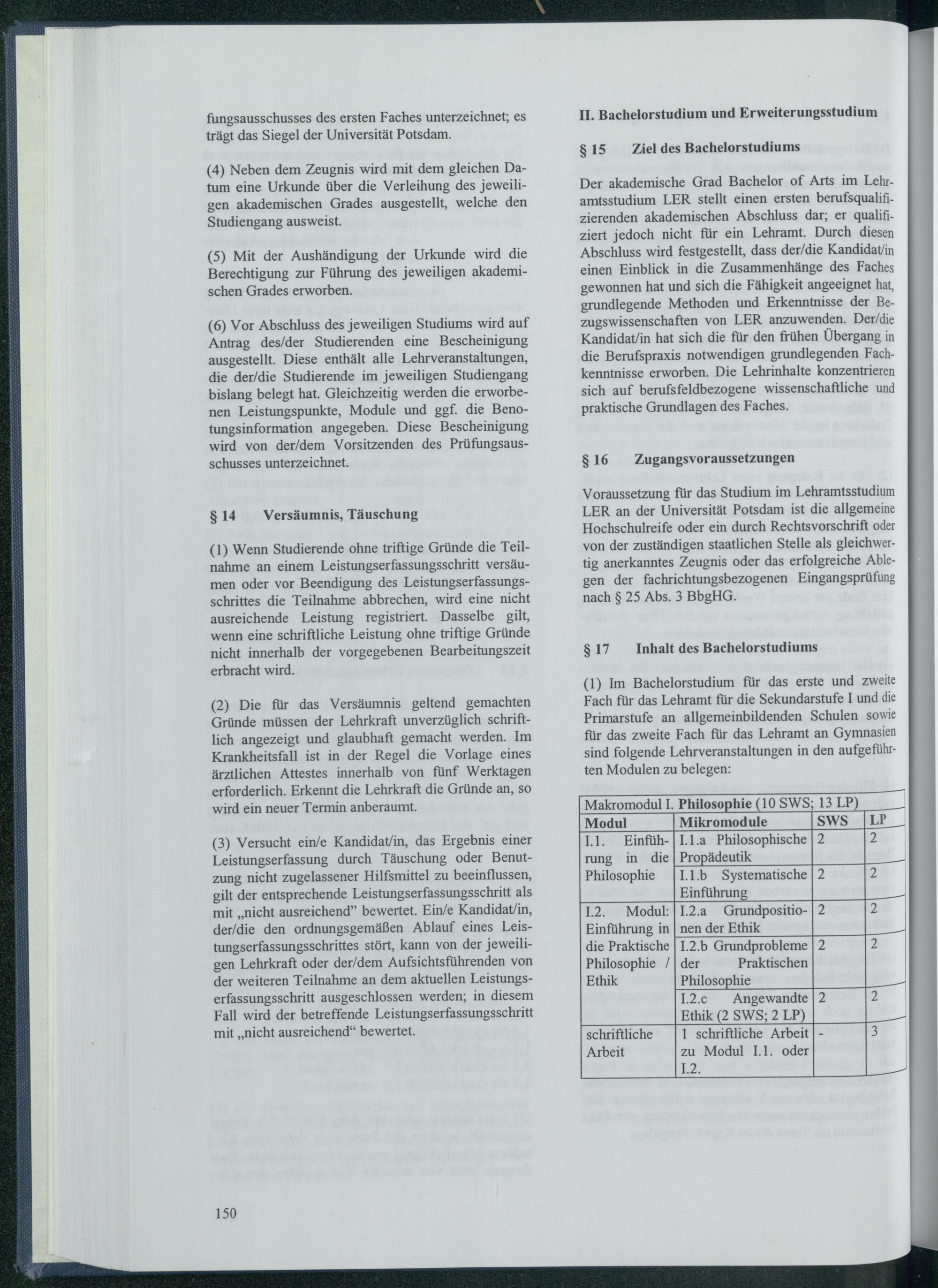 Der akademische Grad Bachelor of Arts im Lehramtsstudium LER stellt einen ersten berufsqualifizierenden akademischen Abschluss dar; er qualifiziert jedoch nicht für ein Lehramt. Durch diesen Abschluss wird festgestellt, dass der/ die Kandidat/ in einen Einblick in die Zusammenhänge des Faches gewonnen hat und sich die Fähigkeit angeeignet hat, grundlegende Methoden und Erkenntnisse der Bezugswissenschaften von LER anzuwenden. Der/ die Kandidat/ in hat sich die für den frühen Übergang in die Berufspraxis notwendigen grundlegenden Fachkenntnisse erworben. Die Lehrinhalte konzentrieren sich auf berufsfeldbezogene wissenschaftliche und praktische Grundlagen des Faches.