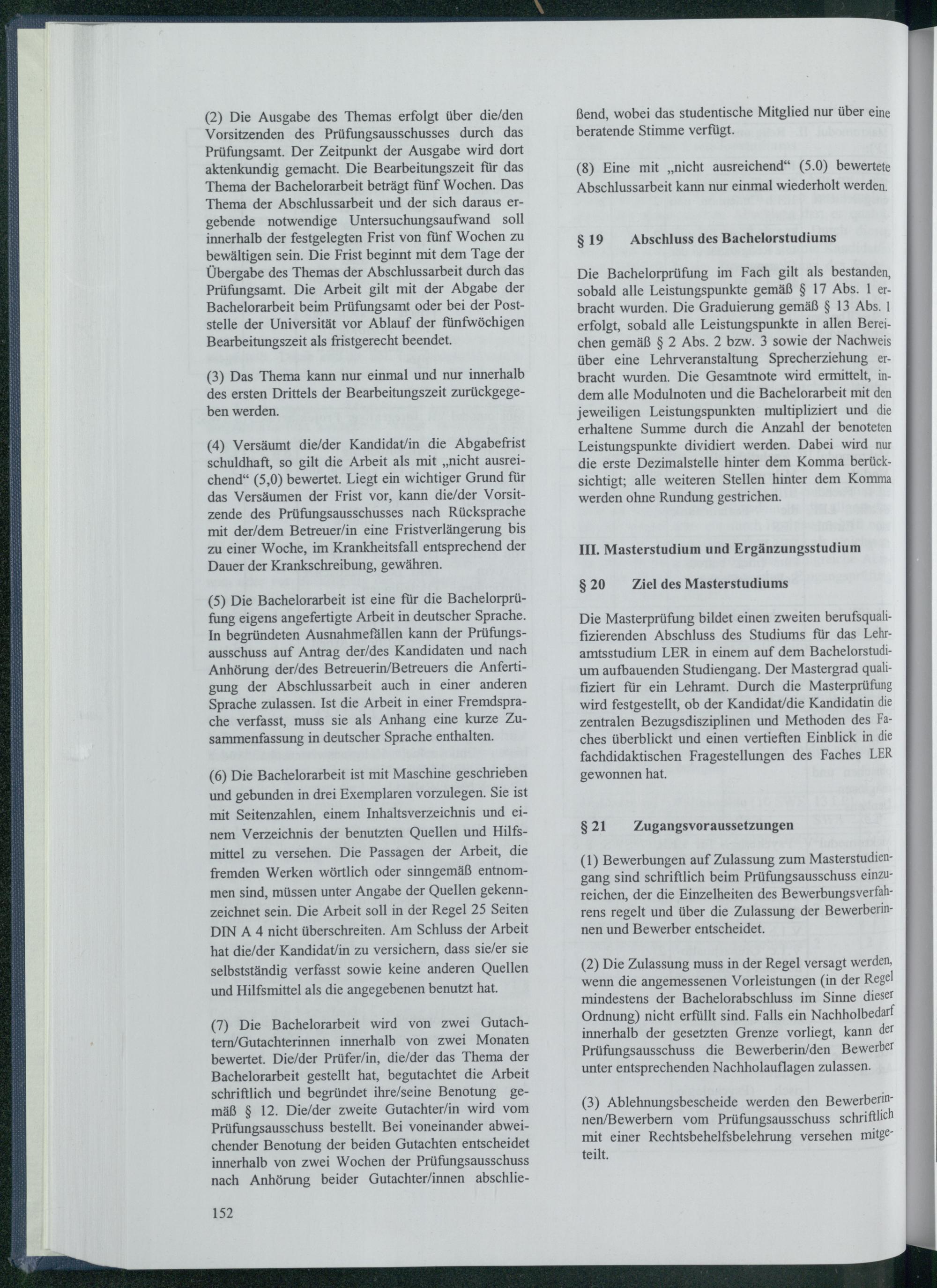 ( 5) Die Bachelorarbeit ist eine für die Bachelorprüfung eigens angefertigte Arbeit in deutscher Sprache. In begründeten Ausnahmefällen kann der Prüfungsausschuss auf Antrag der/ des Kandidaten und nach Anhörung der/ des Betreuerin/ Betreuers die Anfertigung der Abschlussarbeit auch in einer anderen Sprache zulassen. Ist die Arbeit in einer Fremdsprache verfasst, muss sie als Anhang eine kurze Zusammenfassung in deutscher Sprache enthalten.