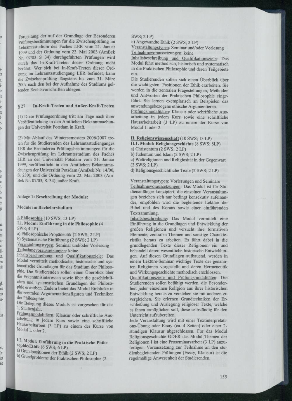 ( 2) Mit Ablauf des Wintersemesters 2006/2007 treten für die Studierenden des Lehramtsstudienganges LER die Besonderen Prüfungsbestimmungen für die Zwischenprüfung im Lehramtsstudium des Faches LER an der Universität Potsdam vom 21. Januar 1999, veröffentlicht in den Amtlichen Bekanntmachungen der Universität Potsdam( AmBek Nr. 14/00, S. 230), und die Ordnung vom 22. Mai 2003( AmBek Nr. 07/03, S. 34), außer Kraft.