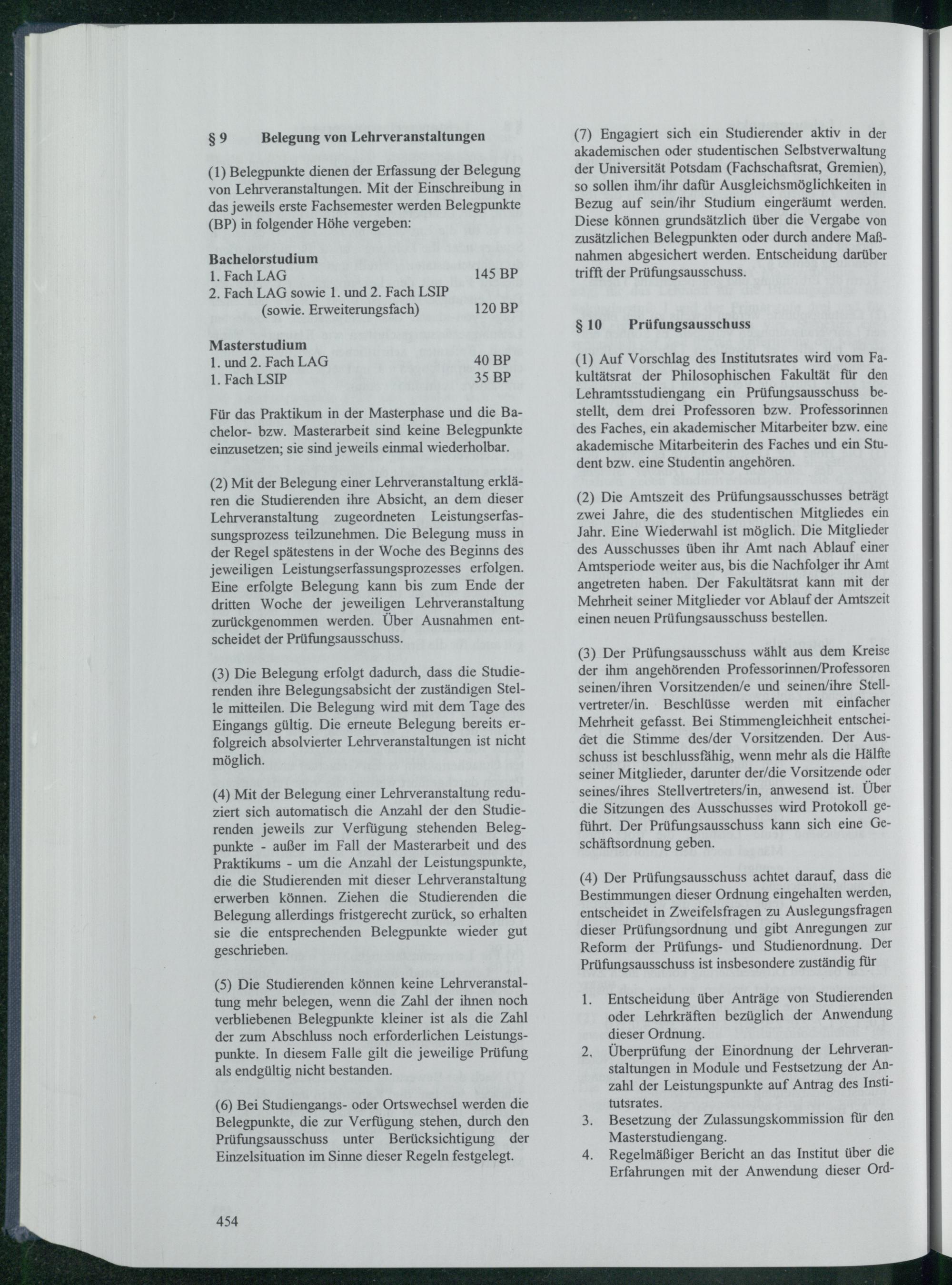 ( 7) Engagiert sich ein Studierender aktiv in der akademischen oder studentischen Selbstverwaltung der Universität Potsdam( Fachschaftsrat, Gremien), so sollen ihm/ ihr dafür Ausgleichsmöglichkeiten in Bezug auf sein/ ihr Studium eingeräumt werden. Diese können grundsätzlich über die Vergabe von zusätzlichen Belegpunkten oder durch andere Maẞnahmen abgesichert werden. Entscheidung darüber trifft der Prüfungsausschuss.