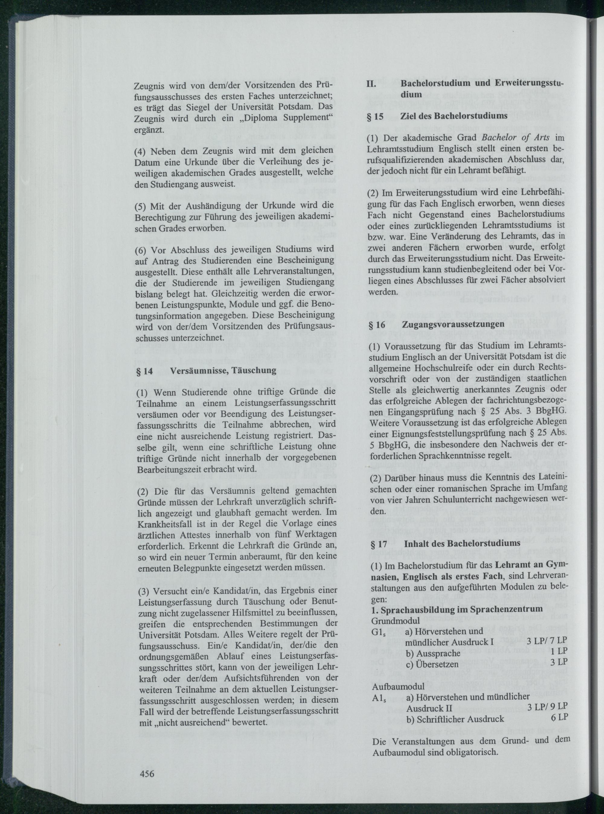 ( 1) Voraussetzung für das Studium im Lehramtsstudium Englisch an der Universität Potsdam ist die allgemeine Hochschulreife oder ein durch Rechtsvorschrift oder von der zuständigen staatlichen Stelle als gleichwertig anerkanntes Zeugnis oder das erfolgreiche Ablegen der fachrichtungsbezogenen Eingangsprüfung nach§ 25 Abs. 3 BbgHG. Weitere Voraussetzung ist das erfolgreiche Ablegen einer Eignungsfeststellungsprüfung nach§ 25 Abs. 5 BbgHG, die insbesondere den Nachweis der erforderlichen Sprachkenntnisse regelt.