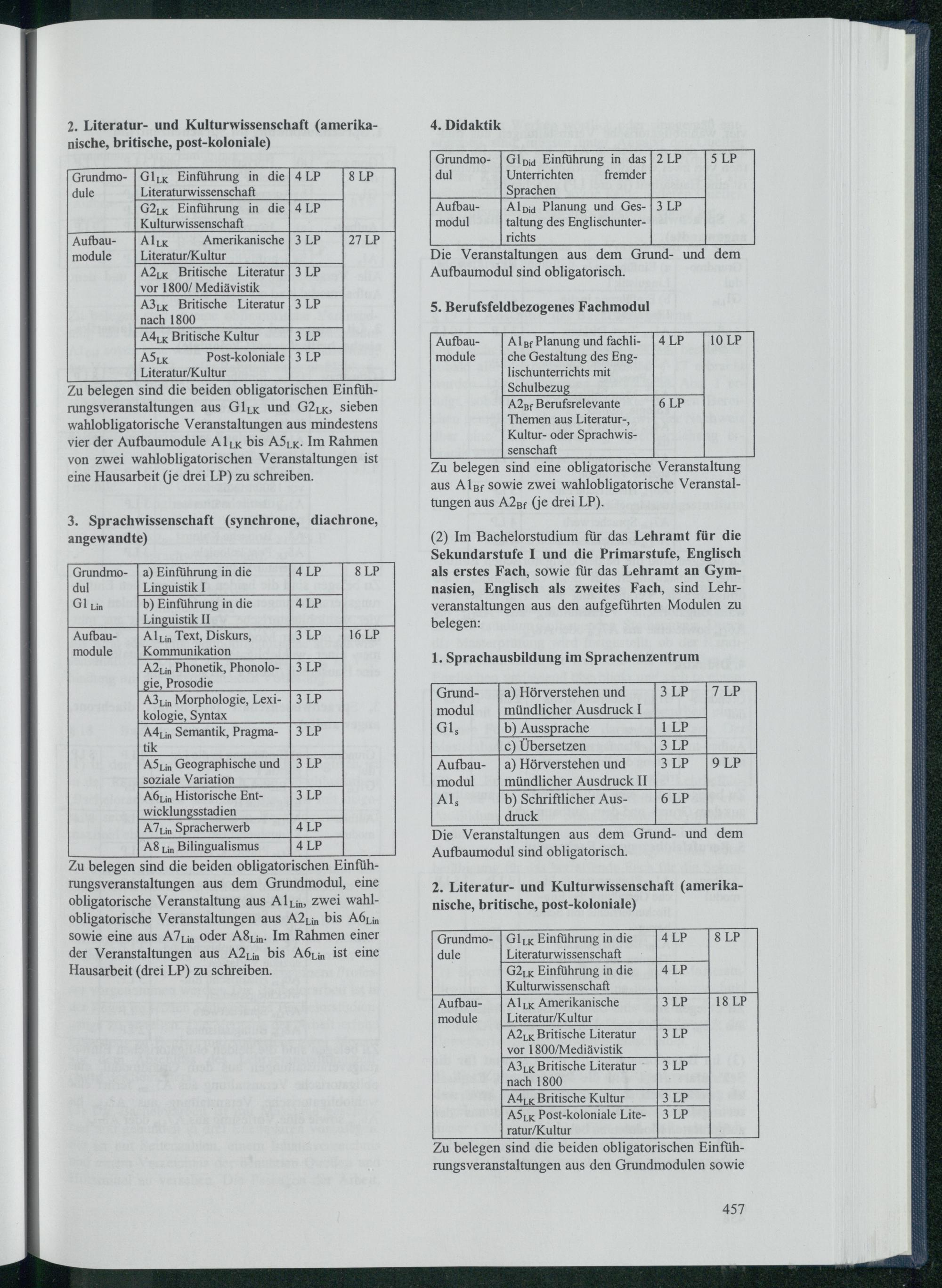 ( 2) Im Bachelorstudium für das Lehramt für die Sekundarstufe I und die Primarstufe, Englisch als erstes Fach, sowie für das Lehramt an Gymnasien, Englisch als zweites Fach, sind Lehrveranstaltungen aus den aufgeführten Modulen zu belegen: