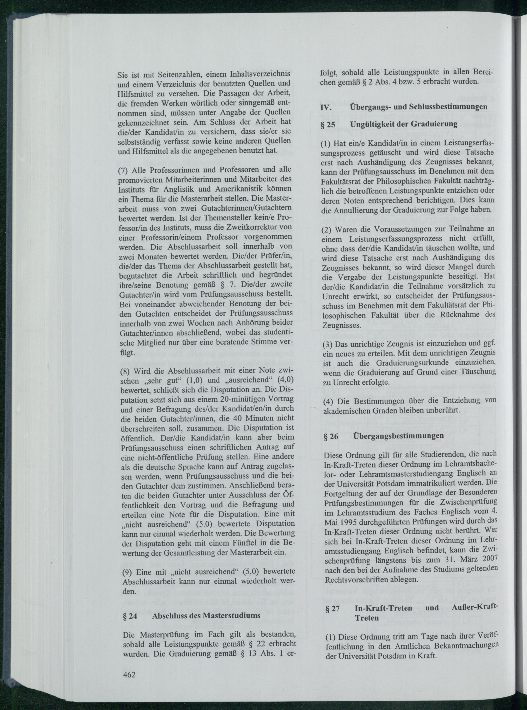Diese Ordnung gilt für alle Studierenden, die nach In- Kraft- Treten dieser Ordnung im Lehramtsbachelor- oder Lehramtsmasterstudiengang Englisch an der Universität Potsdam immatrikuliert werden. Die Fortgeltung der auf der Grundlage der Besonderen Prüfungsbestimmungen für die Zwischenprüfung im Lehramtsstudium des Faches Englisch vom 4. Mai 1995 durchgeführten Prüfungen wird durch das In- Kraft- Treten dieser Ordnung nicht berührt. Wer sich bei In- Kraft- Treten dieser Ordnung im Lehramtsstudiengang Englisch befindet, kann die Zwischenprüfung längstens bis zum 31. März 2007 nach den bei der Aufnahme des Studiums geltenden Rechtsvorschriften ablegen.