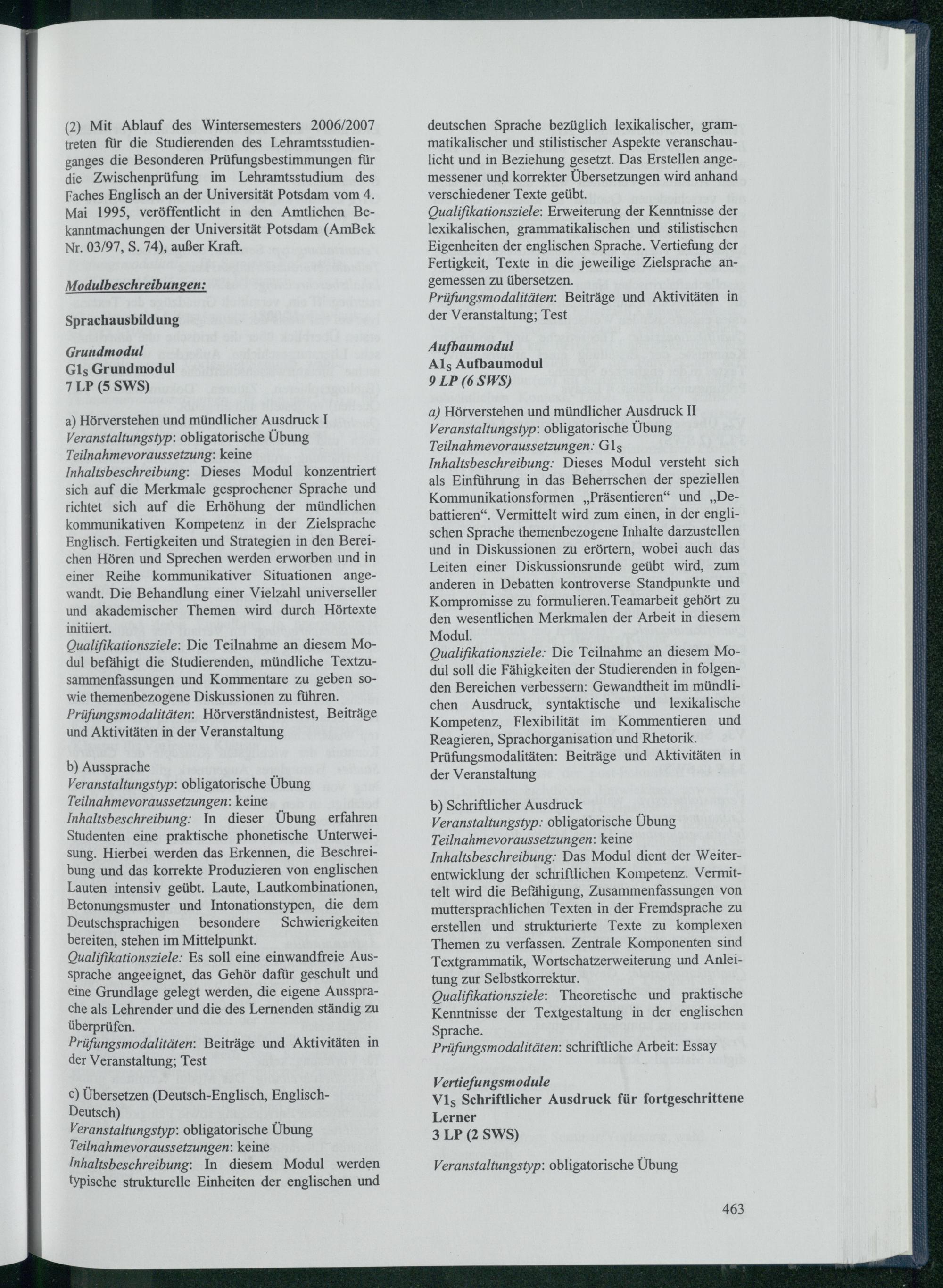 ( 2) Mit Ablauf des Wintersemesters 2006/2007 treten für die Studierenden des Lehramtsstudienganges die Besonderen Prüfungsbestimmungen für die Zwischenprüfung im Lehramtsstudium des Faches Englisch an der Universität Potsdam vom 4. Mai 1995, veröffentlicht in den Amtlichen Bekanntmachungen der Universität Potsdam( AmBek Nr. 03/97, S. 74), außer Kraft.