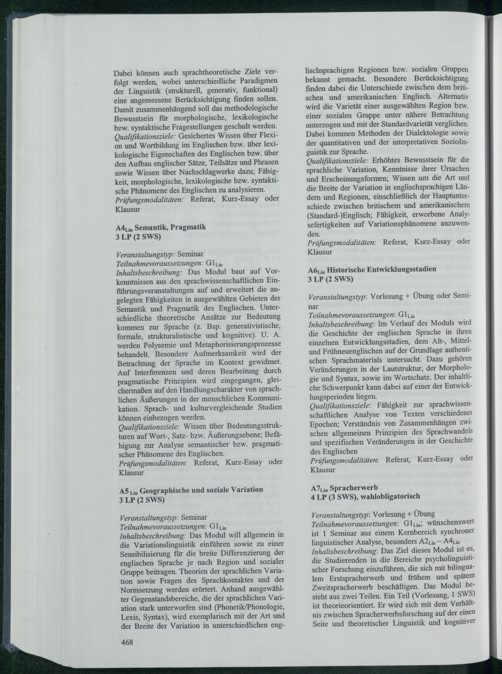Qualifikationsziele: Erhöhtes Bewusstsein für die sprachliche Variation, Kenntnisse ihrer Ursachen und Erscheinungsformen; Wissen um die Art und die Breite der Variation in englischsprachigen Ländern und Regionen, einschließlich der Hauptunterschiede zwischen britischem und amerikanischem ( Standard-) Englisch; Fähigkeit, erworbene Analysefertigkeiten auf Variationsphänomene anzuwen