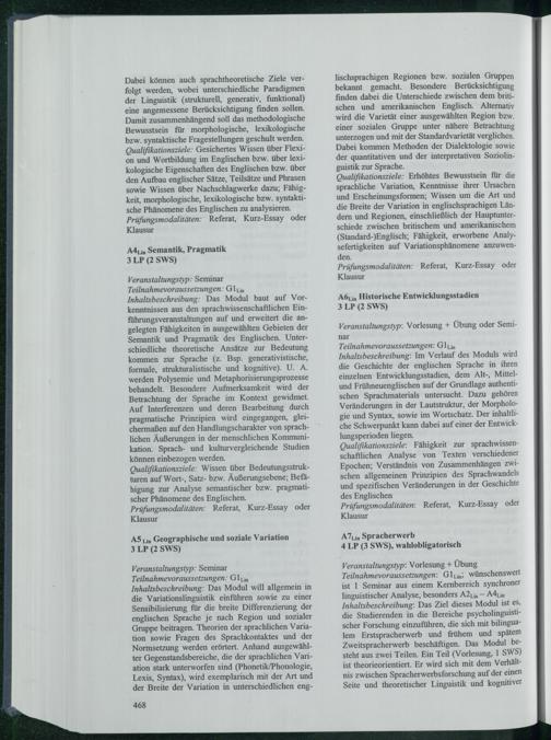 Dabei können auch sprachtheoretische Ziele verfolgt werden, wobei unterschiedliche Paradigmen der Linguistik( strukturell, generativ, funktional) eine angemessene Berücksichtigung finden sollen. Damit zusammenhängend soll das methodologische Bewusstsein für morphologische, lexikologische bzw. syntaktische Fragestellungen geschult werden. Qualifikationsziele: Gesichertes Wissen über Flexion und Wortbildung im Englischen bzw. über lexikologische Eigenschaften des Englischen bzw. über den Aufbau englischer Sätze, Teilsätze und Phrasen sowie Wissen über Nachschlagwerke dazu; Fähigkeit, morphologische, lexikologische bzw. syntaktische Phänomene des Englischen zu analysieren. Prüfungsmodalitäten: Referat, Kurz- Essay oder