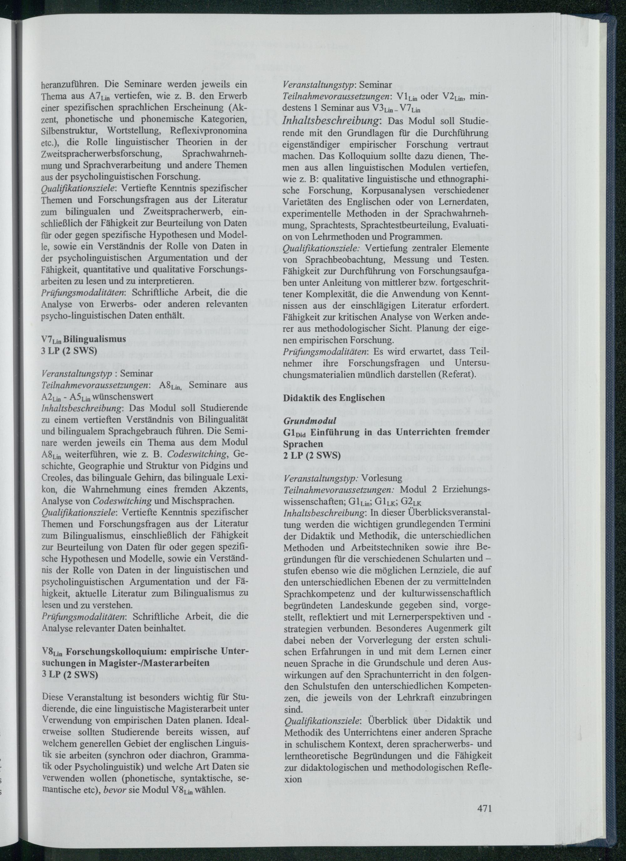 mung und Sprachverarbeitung und andere Themen aus der psycholinguistischen Forschung. Qualifikationsziele: Vertiefte Kenntnis spezifischer Themen und Forschungsfragen aus der Literatur zum bilingualen und Zweitspracherwerb, einschließlich der Fähigkeit zur Beurteilung von Daten für oder gegen spezifische Hypothesen und Modelle, sowie ein Verständnis der Rolle von Daten in der psycholinguistischen Argumentation und der Fähigkeit, quantitative und qualitative Forschungsarbeiten zu lesen und zu interpretieren. Prüfungsmodalitäten: Schriftliche Arbeit, die die Analyse von Erwerbs- oder anderen relevanten psycho- linguistischen Daten enthält.