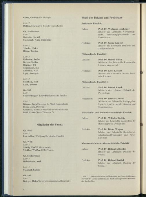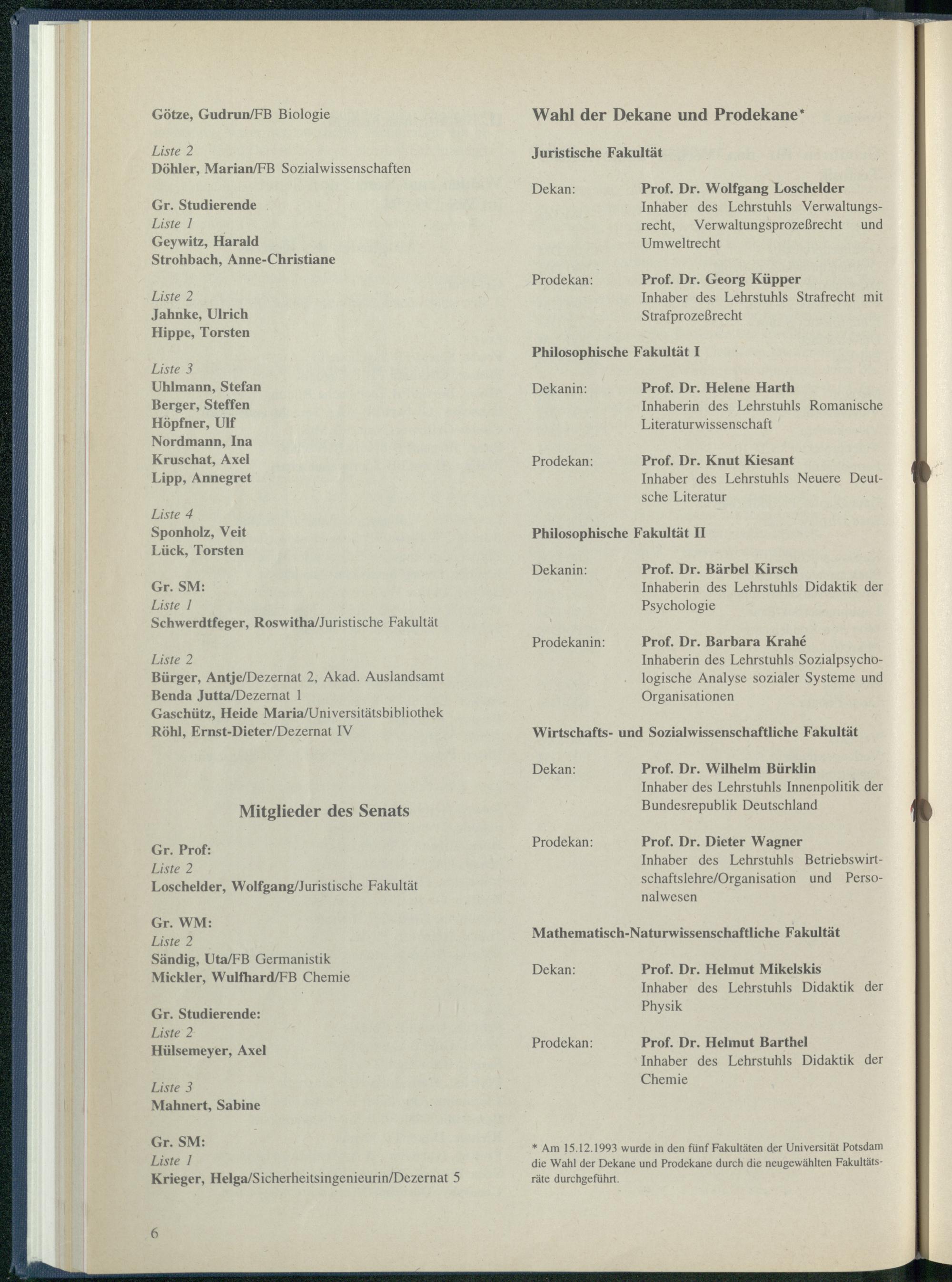 * Am 15.12.1993 wurde in den fünf Fakultäten der Universität Potsdam die Wahl der Dekane und Prodekane durch die neugewählten Fakultätsräte durchgeführt.
