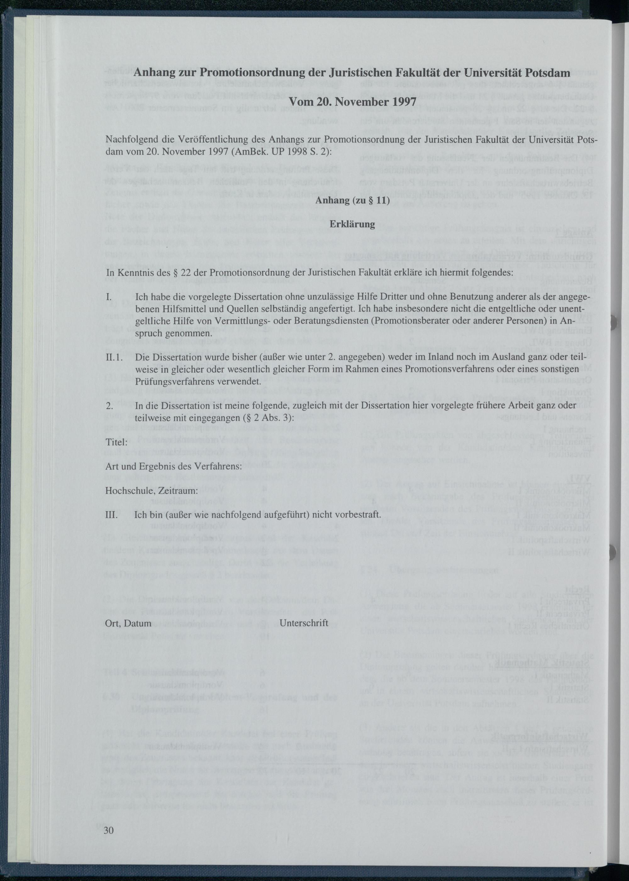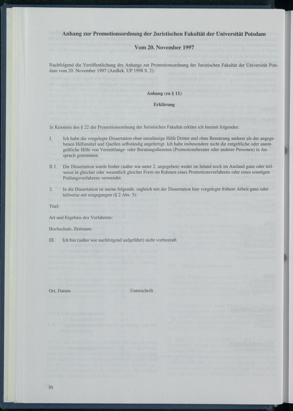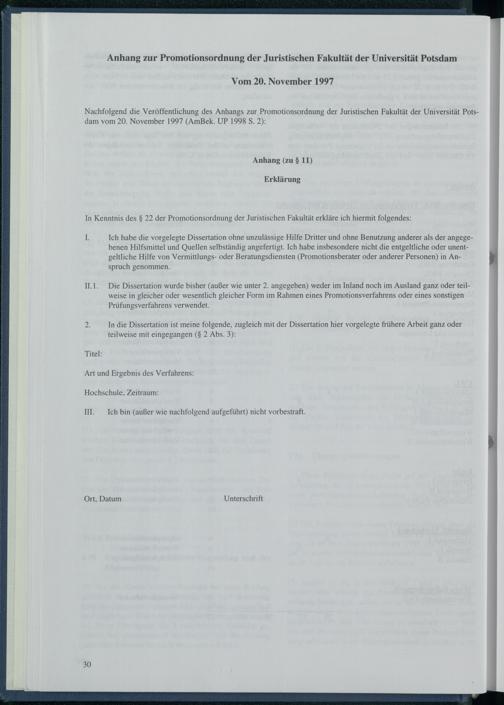 Nachfolgend die Veröffentlichung des Anhangs zur Promotionsordnung der Juristischen Fakultät der Universität Potsdam vom 20. November 1997( AmBek. UP 1998 S. 2):