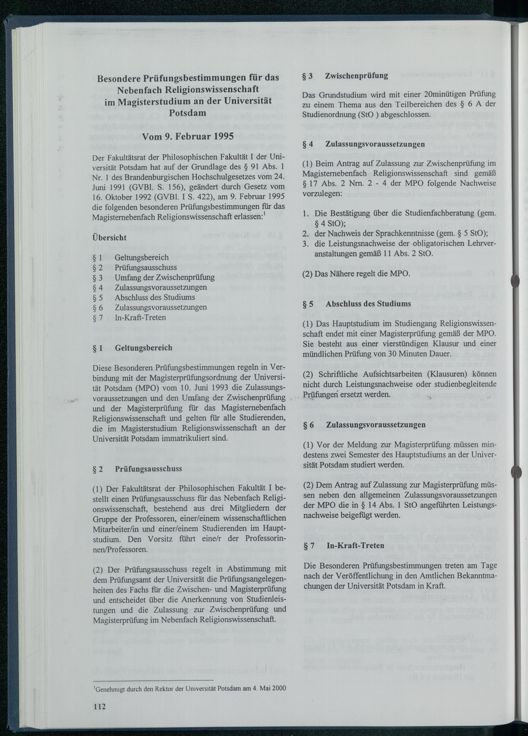 Diese Besonderen Prüfungsbestimmungen regeln in Verbindung mit der Magisterprüfungsordnung der Universität Potsdam( MPO) vom 10. Juni 1993 die Zulassungsvoraussetzungen und den Umfang der Zwischenprüfung und der Magisterprüfung für das Magisternebenfach Religionswissenschaft und gelten für alle Studierenden, die im Magisterstudium Religionswissenschaft an der Universität Potsdam immatrikuliert sind.