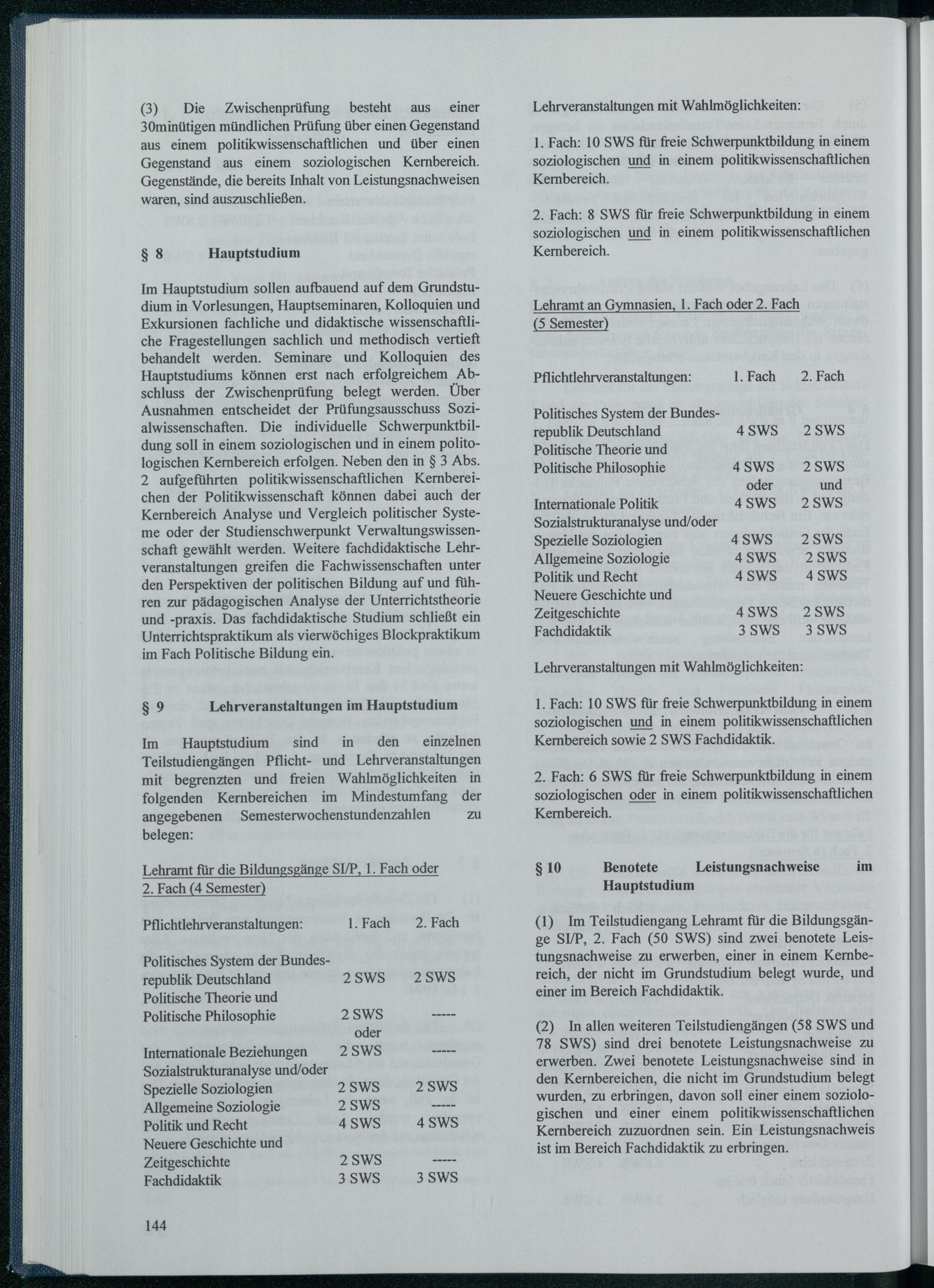 Im Hauptstudium sollen aufbauend auf dem Grundstudium in Vorlesungen, Hauptseminaren, Kolloquien und Exkursionen fachliche und didaktische wissenschaftliche Fragestellungen sachlich und methodisch vertieft behandelt werden. Seminare und Kolloquien des Hauptstudiums können erst nach erfolgreichem Abschluss der Zwischenprüfung belegt werden. Über Ausnahmen entscheidet der Prüfungsausschuss Sozialwissenschaften. Die individuelle Schwerpunktbildung soll in einem soziologischen und in einem politologischen Kernbereich erfolgen. Neben den in§ 3 Abs. 2 aufgeführten politikwissenschaftlichen Kernbereichen der Politikwissenschaft können dabei auch der Kernbereich Analyse und Vergleich politischer Systeme oder der Studienschwerpunkt Verwaltungswissenschaft gewählt werden. Weitere fachdidaktische Lehrveranstaltungen greifen die Fachwissenschaften unter den Perspektiven der politischen Bildung auf und führen zur pädagogischen Analyse der Unterrichtstheorie und-praxis. Das fachdidaktische Studium schließt ein Unterrichtspraktikum als vierwöchiges Blockpraktikum im Fach Politische Bildung ein.