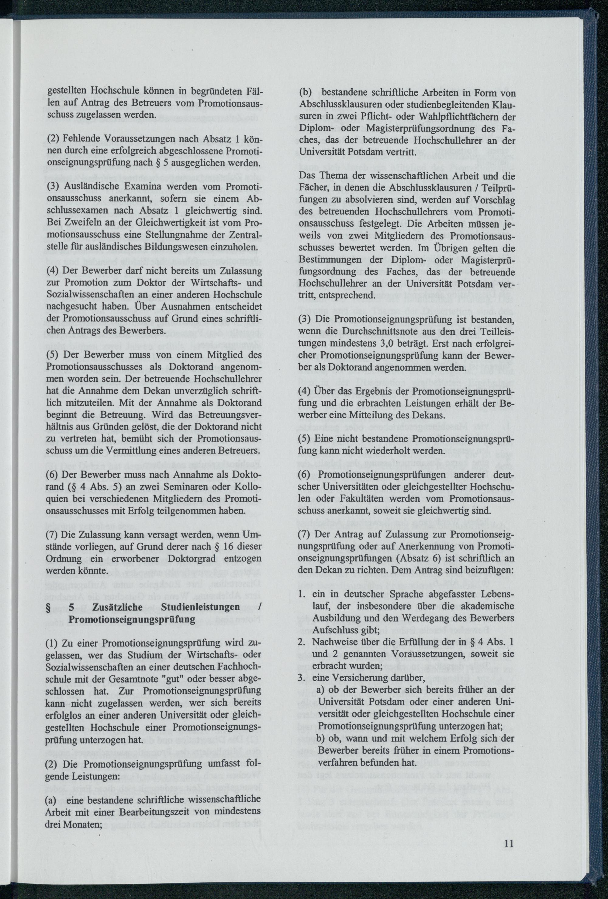 ( 1) Zu einer Promotionseignungsprüfung wird zugelassen, wer das Studium der Wirtschafts- oder Sozialwissenschaften an einer deutschen Fachhochschule mit der Gesamtnote" gut" oder besser abgeschlossen hat. Zur Promotionseignungsprüfung kann nicht zugelassen werden, wer sich bereits erfolglos an einer anderen Universität oder gleichgestellten Hochschule einer Promotionseignungsprüfung unterzogen hat.