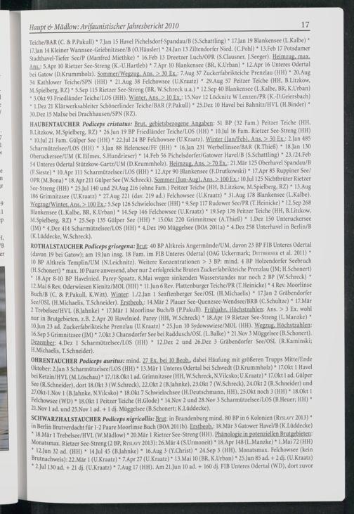 HAUBENTAUCHER Podiceps cristatus: Brut, gebietsbezogene Angaben: 51 BP(32 Fam.) Peitzer Teiche(HH , B.Litzkow, M.Spielberg, RZ)* 26.Jun 19 BP Friedländer Teiche/LOS(HH )* 10.Jul 16 Fam. Rietzer See-Streng(HH ) * 10.Jul 21 Fam. Gülper See(HH )* 22.Jul 24 BP Felchowsee(U.Kraatz). Winter(Jan/Feb), Ans.> 50 Ex.: 2.Jan 485 Scharmützelsee/LOS(HH )* 3.Jan 88 Helenesee/FF(HH )* 16.Jan 231 Werbellinsee/BAR(R.Thieß)* 18.Jan 130 Oberuckersee/UM(K.Eilmes, S.Hundrieser)* 14.Feb 56 Pichelsdorfer/Gatower Havel/B (S.Schattling)* 23./24.Feb 54 Unteres Odertal Stützkow-Gartz/UM(D.Krummholz). Heimzug, Ans.> 70 Ex.: 21.Mär 125 Oberhavel Spandau/B (F,Sieste)* 10.Apr 111 Scharmützelsee/LOS(HH )* 12.Apr 90 Blankensee(F.Drutkowski)* 17.Apr 85 Ruppiner See/ OPR (M.Bona)* 18.Apr 211 Gülper See(W.Schreck). Sommer(Jun-Aug), Ans.> 100 Ex.: 10.Jul 125 Nichtbrüter Rietzer See-Streng(HH )* 25.Jul 140 und 29.Aug 216(ohne Fam.) Peitzer Teiche(HH , B.Litzkow, M.Spielberg, RZ)* 13.Aug 186 Grimnitzsee(U.Kraatz)* 27.Aug 221(dav . 219 ad.) Felchowsee(U.Kraatz)* 31.Aug 178 Blankensee(L.Kalbe). Wegzug/Winter, Ans.> 100 Ex.: 5.Sep 126 Schwielochsee (HH )* 9.Sep 117 Rudower See/PR(T.Heinicke)* 12.Sep 268 Blankensee(L.Kalbe, BR , K.Urban)* 14.Sep 146 Felchowsee(U.Kraatz)* 19.Sep 176 Peitzer Teiche(HH , B.Litzkow, M.Spielberg, RZ)* 25.Sep 135 Gülper See(HH )* 15.Okt 220 Grimnitzsee(A.Thieß)* 1.Dez 150 Unteruckersee (JM)* 4.Dez 414 Scharmützelsee/LOS(HH )* 4.Dez 190 Müggelsee(BOA 2011a)* 4.Dez 258 Unterhavel in Berlin/B (K.Lüddecke, W.Schreck).