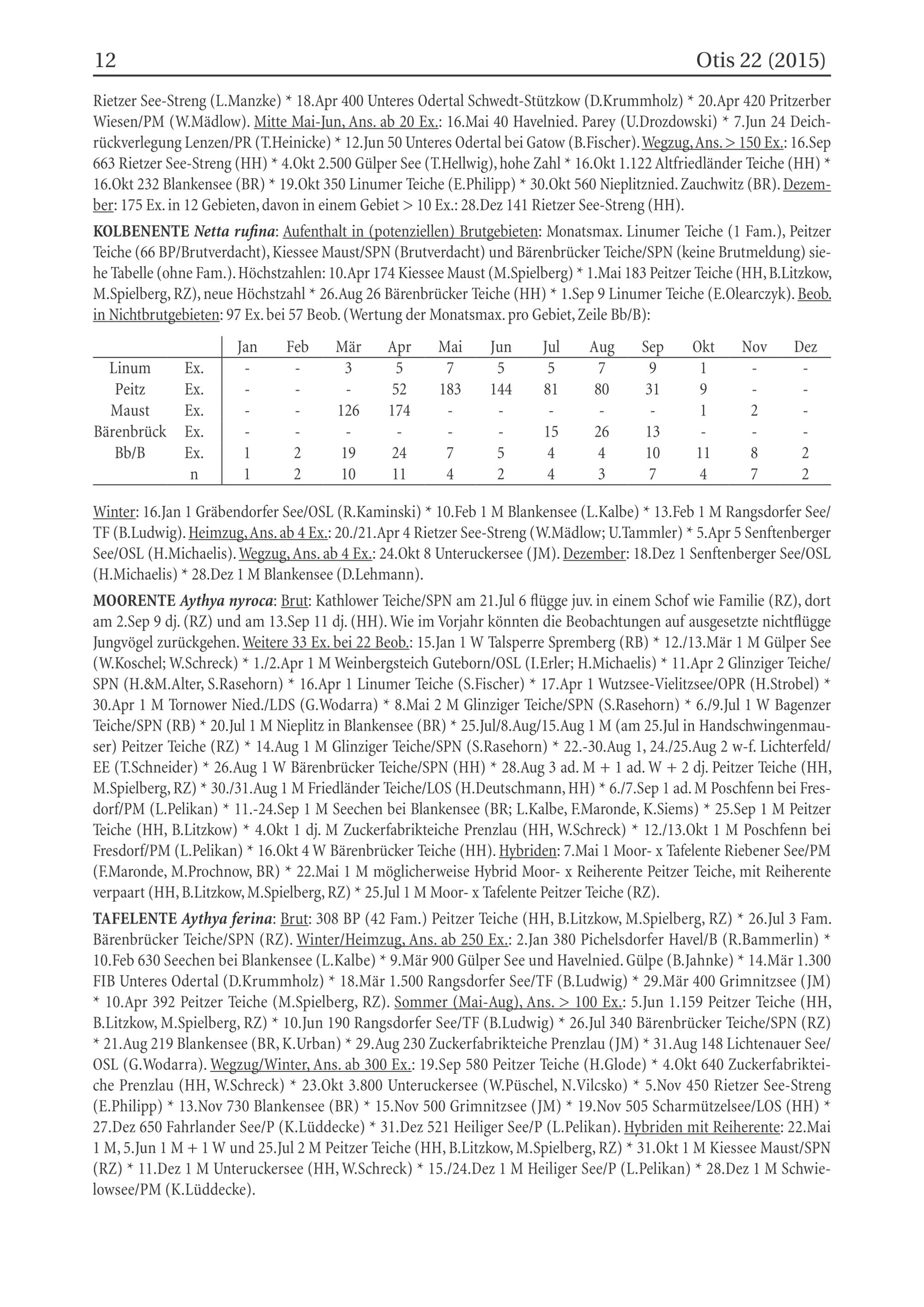 TAFELENTE Aythya ferina: Brut: 308 BP(42 Fam.) Peitzer Teiche (HH, B.Litzkow, M.Spielberg, RZ)* 26.Jul 3 Fam. Bärenbrücker Teiche/SPN (RZ). Winter/Heimzug, Ans. ab 250 Ex.: 2.Jan 380 Pichelsdorfer Havel/B (R.Bammerlin)* 10.Feb 630 Seechen bei Blankensee (L.Kalbe)* 9.Mär 900 Gülper See und Havelnied. Gülpe(B.Jahnke)* 14.Mär 1.300 FIB Unteres Odertal(D.Krummholz)* 18.Mär 1.500 Rangsdorfer See/TF(B.Ludwig)* 29.Mär 400 Grimnitzsee(JM) * 10.Apr 392 Peitzer Teiche(M.Spielberg, RZ). Sommer(Mai-Aug), Ans.> 100 Ex.: 5.Jun 1.159 Peitzer Teiche (HH, B.Litzkow, M.Spielberg, RZ)* 10.Jun 190 Rangsdorfer See/TF(B.Ludwig)* 26.Jul 340 Bärenbrücker Teiche/SPN (RZ) * 21.Aug 219 Blankensee (BR, K.Urban)* 29.Aug 230 Zuckerfabrikteiche Prenzlau(JM)* 31.Aug 148 Lichtenauer See/ OSL(G.Wodarra). Wegzug/Winter, Ans. ab 300 Ex.: 19.Sep 580 Peitzer Teiche(H.Glode)* 4.Okt 640 Zuckerfabrikteiche Prenzlau (HH, W.Schreck)* 23.Okt 3.800 Unteruckersee(W.Püschel, N.Vilcsko)* 5.Nov 450 Rietzer See-Streng (E.Philipp)* 13.Nov 730 Blankensee (BR)* 15.Nov 500 Grimnitzsee(JM)* 19.Nov 505 Scharmützelsee/LOS(HH)* 27.Dez 650 Fahrlander See/P(K.Lüddecke)* 31.Dez 521 Heiliger See/P(L.Pelikan). Hybriden mit Reiherente: 22.Mai 1 M,5.Jun 1 M+ 1 W und 25.Jul 2 M Peitzer Teiche(HH, B.Litzkow, M.Spielberg, RZ)* 31.Okt 1 M Kiessee Maust/SPN (RZ)* 11.Dez 1 M Unteruckersee (HH, W.Schreck)* 15./24.Dez 1 M Heiliger See/P(L.Pelikan)* 28.Dez 1 M Schwielowsee/PM(K.Lüddecke).