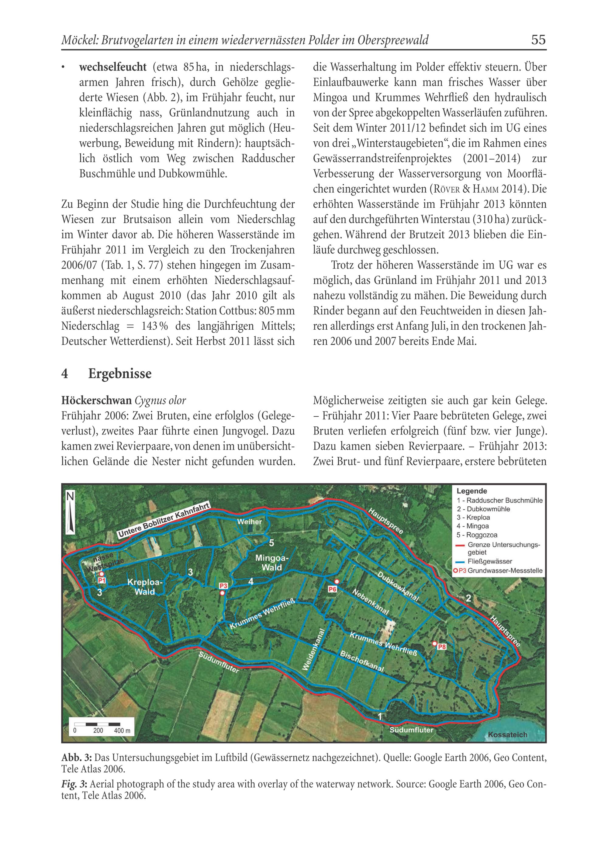 die Wasserhaltung im Polder effektiv steuern. Über Einlaufbauwerke kann man frisches Wasser über Mingoa und Krummes Wehrfließ den hydraulisch von der Spree abgekoppelten Wasserläufen zuführen. Seit dem Winter 2011/12 befindet sich im UG eines von drei„Winterstaugebieten“, die im Rahmen eines Gewässerrandstreifenprojektes(2001-2014) zur Verbesserung der Wasserversorgung von Moorflächen eingerichtet wurden(Röver& Hamm 2014). Die erhöhten Wasserstände im Frühjahr 2013 könnten auf den durchgeführten Winterstau(310 ha) zurückgehen. Während der Brutzeit 2013 blieben die Einläufe durchweg geschlossen.