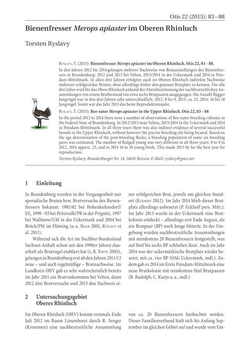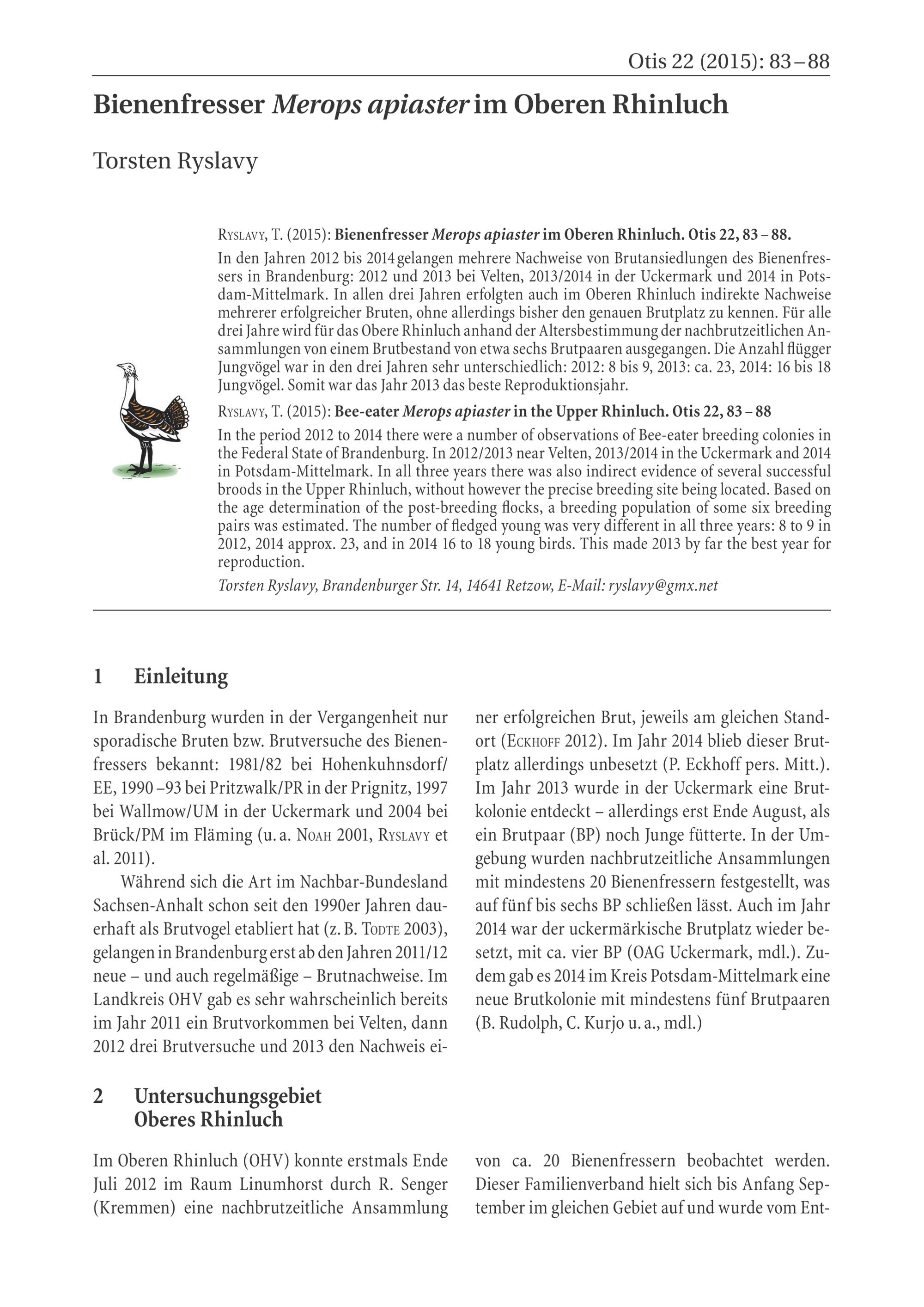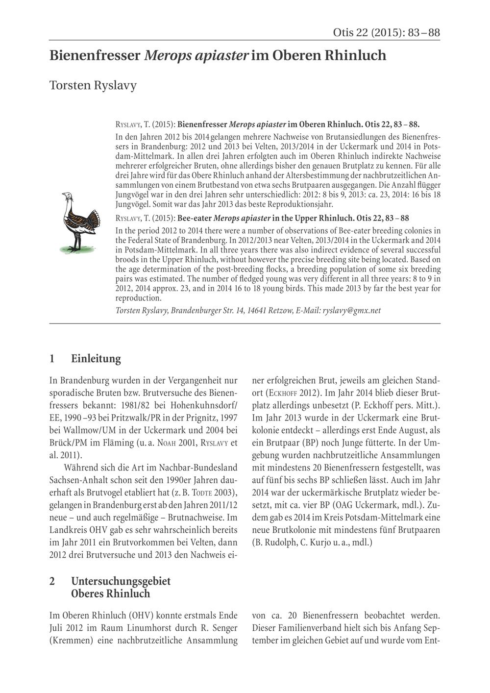 RysLAvy, T.(2015): Bee-eater Merops apiaster in the Upper Rhinluch. Otis 22, 83— 88