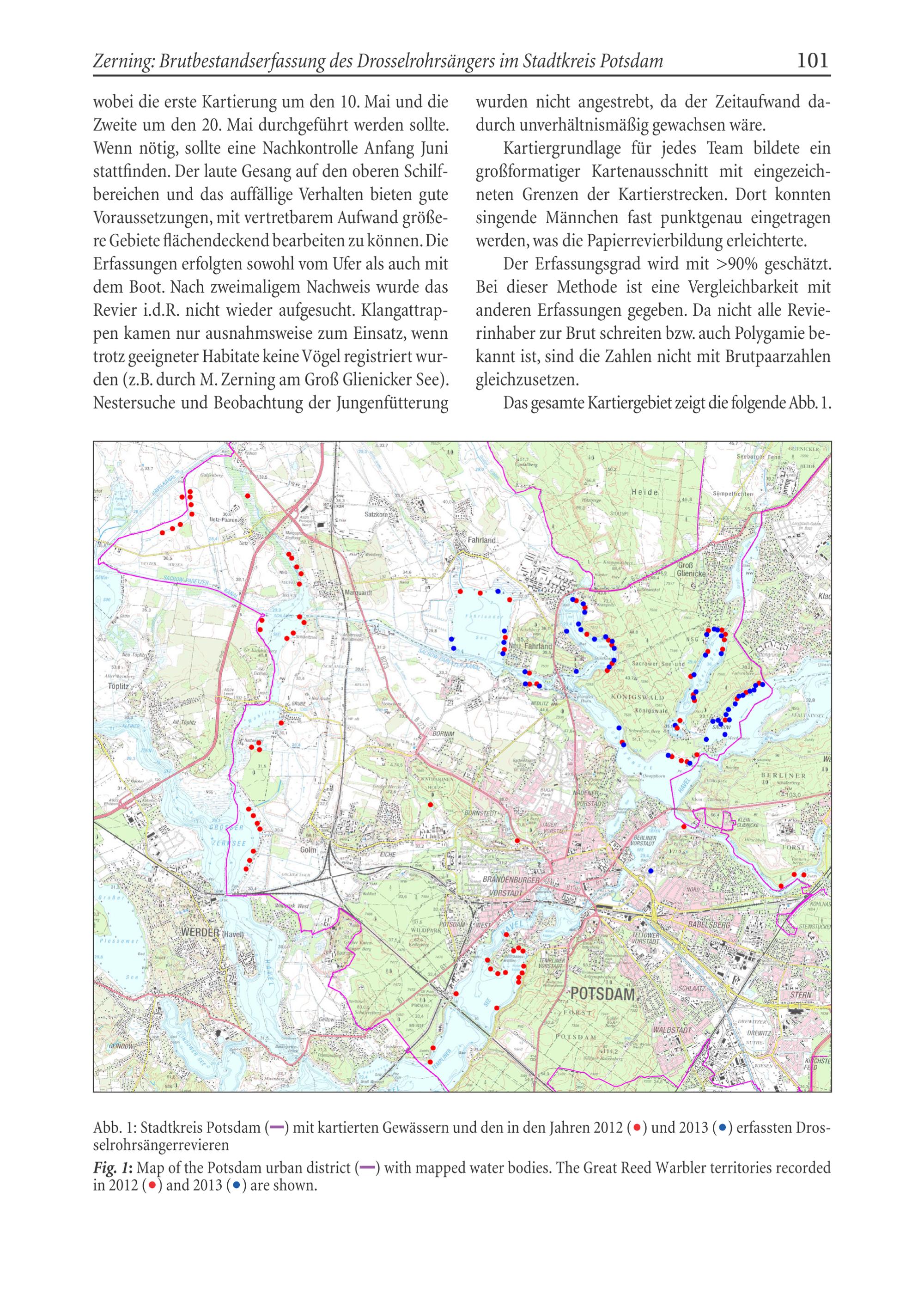 wobei die erste Kartierung um den 10. Mai und die Zweite um den 20. Mai durchgeführt werden sollte. Wenn nötig, sollte eine Nachkontrolle Anfang Juni stattfinden. Der laute Gesang auf den oberen Schilfbereichen und das auffällige Verhalten bieten gute Voraussetzungen, mit vertretbarem Aufwand größere Gebiete flächendeckend bearbeiten zu können. Die Erfassungen erfolgten sowohl vom Ufer als auch mit dem Boot. Nach zweimaligem Nachweis wurde das Revier i.d.R. nicht wieder aufgesucht. Klangattrappen kamen nur ausnahmsweise zum Einsatz, wenn trotz geeigneter Habitate keine Vögel registriert wurden(z.B. durch M. Zerning am Groß Glienicker See). Nestersuche und Beobachtung der Jungenfütterung