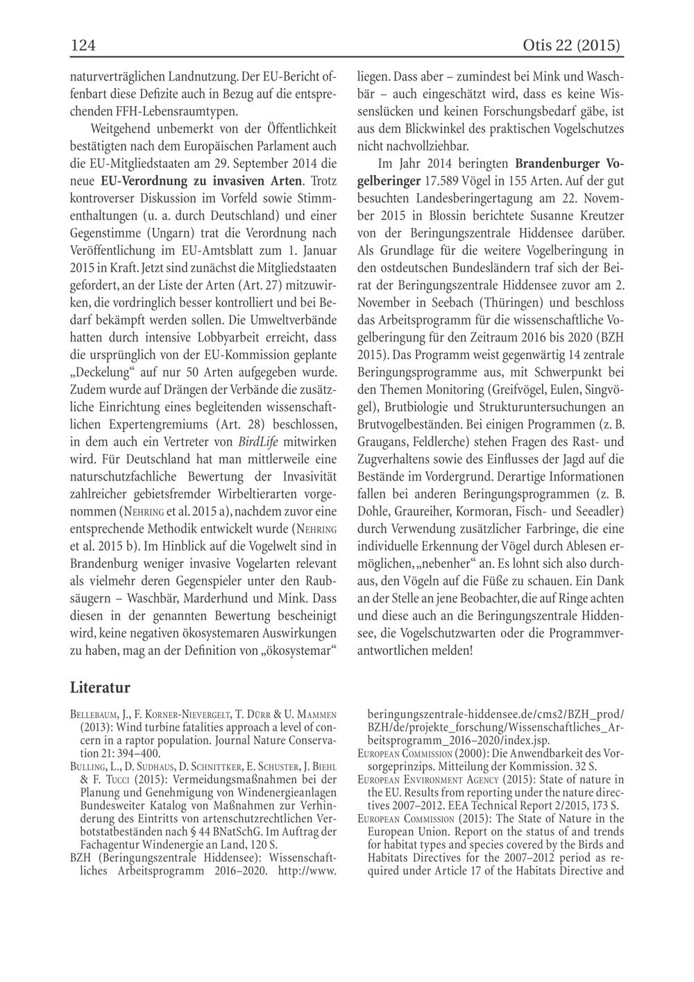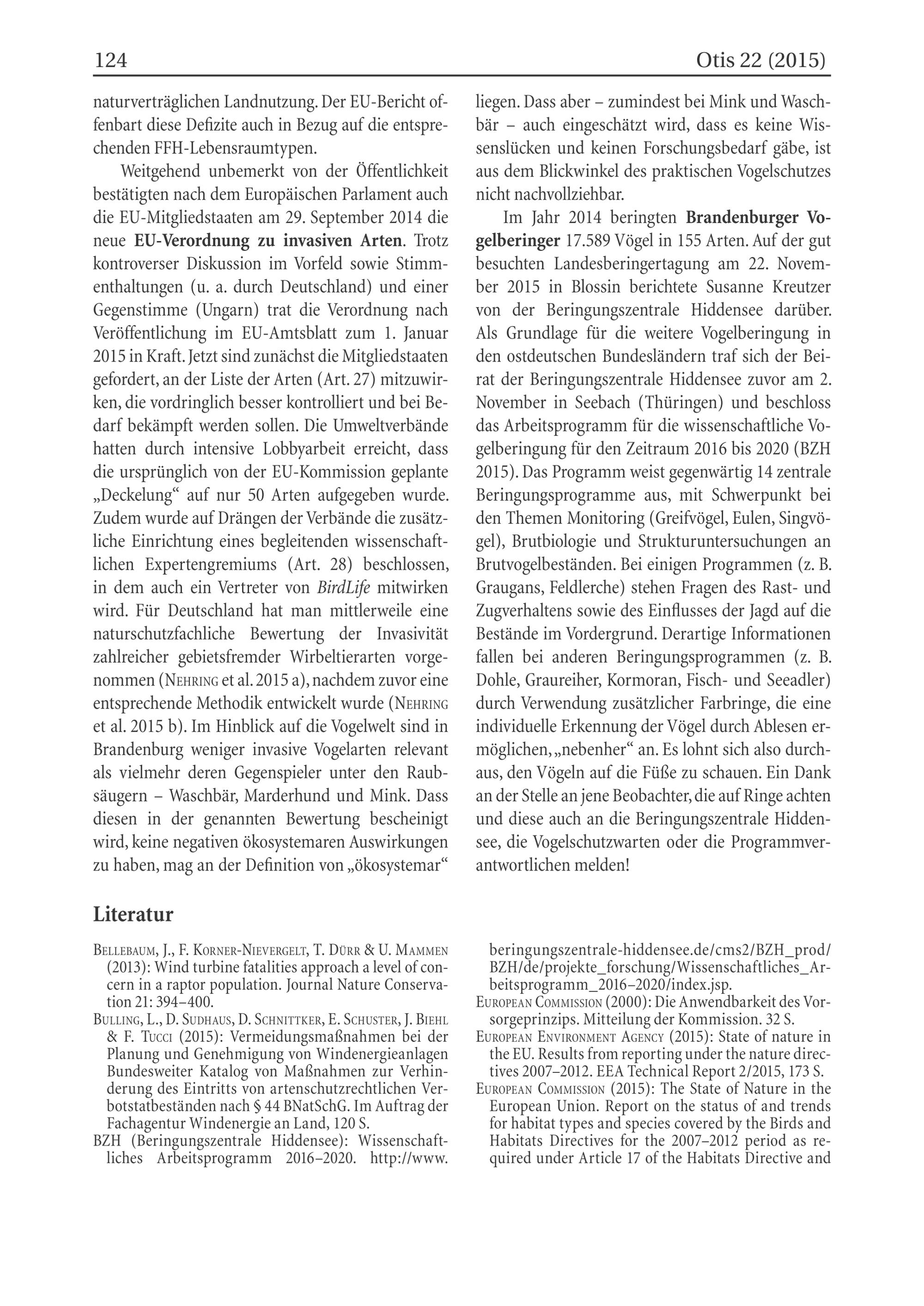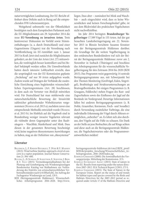 Weitgehend unbemerkt von der Öffentlichkeit bestätigten nach dem Europäischen Parlament auch die EU -Mitgliedstaaten am 29. September 2014 die neue EU -Verordnung zu invasiven Arten. Trotz kontroverser Diskussion im Vorfeld sowie Stimmenthaltungen(u. a. durch Deutschland ) und einer Gegenstimme(Ungarn ) trat die Verordnung nach Veröffentlichung im EU -Amtsblatt zum 1. Januar 2015 in Kraft. Jetzt sind zunächst die Mitgliedstaaten gefordert, an der Liste der Arten(Art. 27) mitzuwirken, die vordringlich besser kontrolliert und bei Bedarf bekämpft werden sollen. Die Umweltverbände hatten durch intensive Lobbyarbeit erreicht, dass die ursprünglich von der EU-Kommission geplante „Deckelung“ auf nur 50 Arten aufgegeben wurde. Zudem wurde auf Drängen der Verbände die zusätzliche Einrichtung eines begleitenden wissenschaftlichen Expertengremiums(Art. 28) beschlossen, in dem auch ein Vertreter von BirdLife mitwirken wird. Für Deutschland hat man mittlerweile eine naturschutzfachliche Bewertung der Invasivität zahlreicher gebietsfremder Wirbeltierarten vorgenommen(NeHRınG et al. 2015 a), nachdem zuvor eine entsprechende Methodik entwickelt wurde(NEHRING et al. 2015 b). Im Hinblick auf die Vogelwelt sind in Brandenburg weniger invasive Vogelarten relevant als vielmehr deren Gegenspieler unter den Raubsäugern- Waschbär, Marderhund und Mink. Dass diesen in der genannten Bewertung bescheinigt wird, keine negativen ökosystemaren Auswirkungen zu haben, mag an der Definition von„ökosystemar“