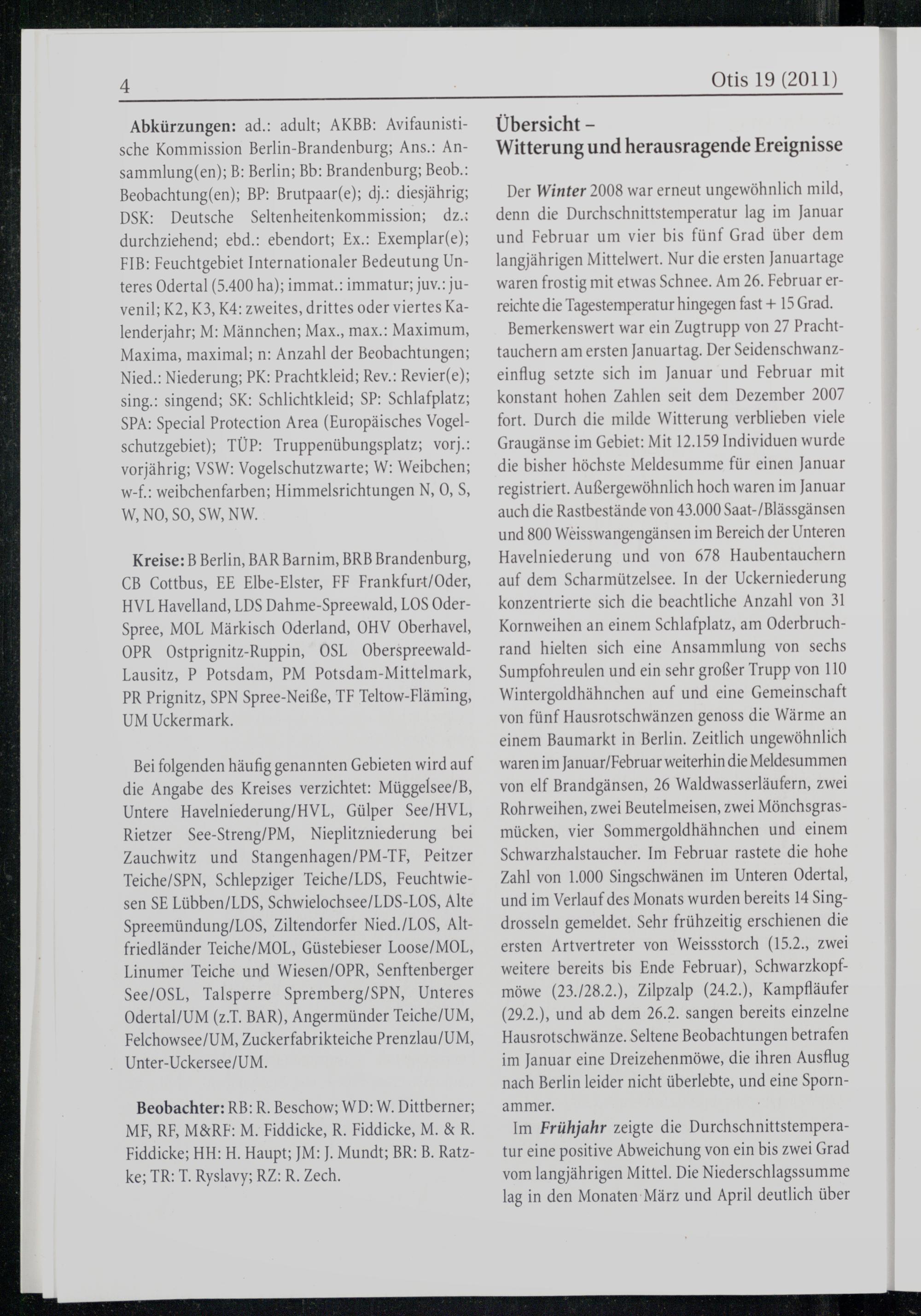 Abkürzungen: ad.: adult; AKBB: Avifaunistische Kommission Berlin-Brandenburg; Ans.: Ansammlung(en); B: Berlin ; Bb : Brandenburg ; Beob.: Beobachtung(en); BP: Brutpaar(e); dj.: diesjährig; DSK: Deutsche durchziehend; ebd.: ebendort; Ex.: Exemplar(e); FIB: Feuchtgebiet Internationaler Bedeutung Unteres Odertal(5.400 ha); immat.: immatur; Juv.: Juvenil; K2, K3, K4: zweites, drittes oder viertes lenderjahr; M: Männchen; Max., max.: Maximum, Maxima, maximal; n: Anzahl der Beobachtungen; Nied. : Niederung; PK: Prachtkleid; Rev.: Revier(e); sing.: singend; SK: Schlichtkleid; SP: Schlafplatz; SPA: Special Protection Area(Europäisches Vogelschutzgebiet); TÜP: Truppenübungsplatz; vorj.: vorjährig; VSW: Vogelschutzwarte; W: Weibchen; w-f.: weibchenfarben; Himmelsrichtungen N, 0, S, W, NO, SO, SW, NW.