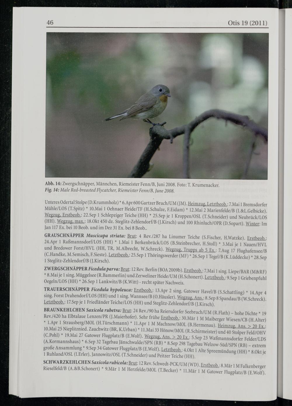 Abb. 14: Zwergschnäpper, Männchen, Riemeister Fenn/B, Juni 2008. Foto: T. Kru menacker. Fig. 14: Male Red-breasted Flycatcher, Riemeister Fenn/B, June 2008.