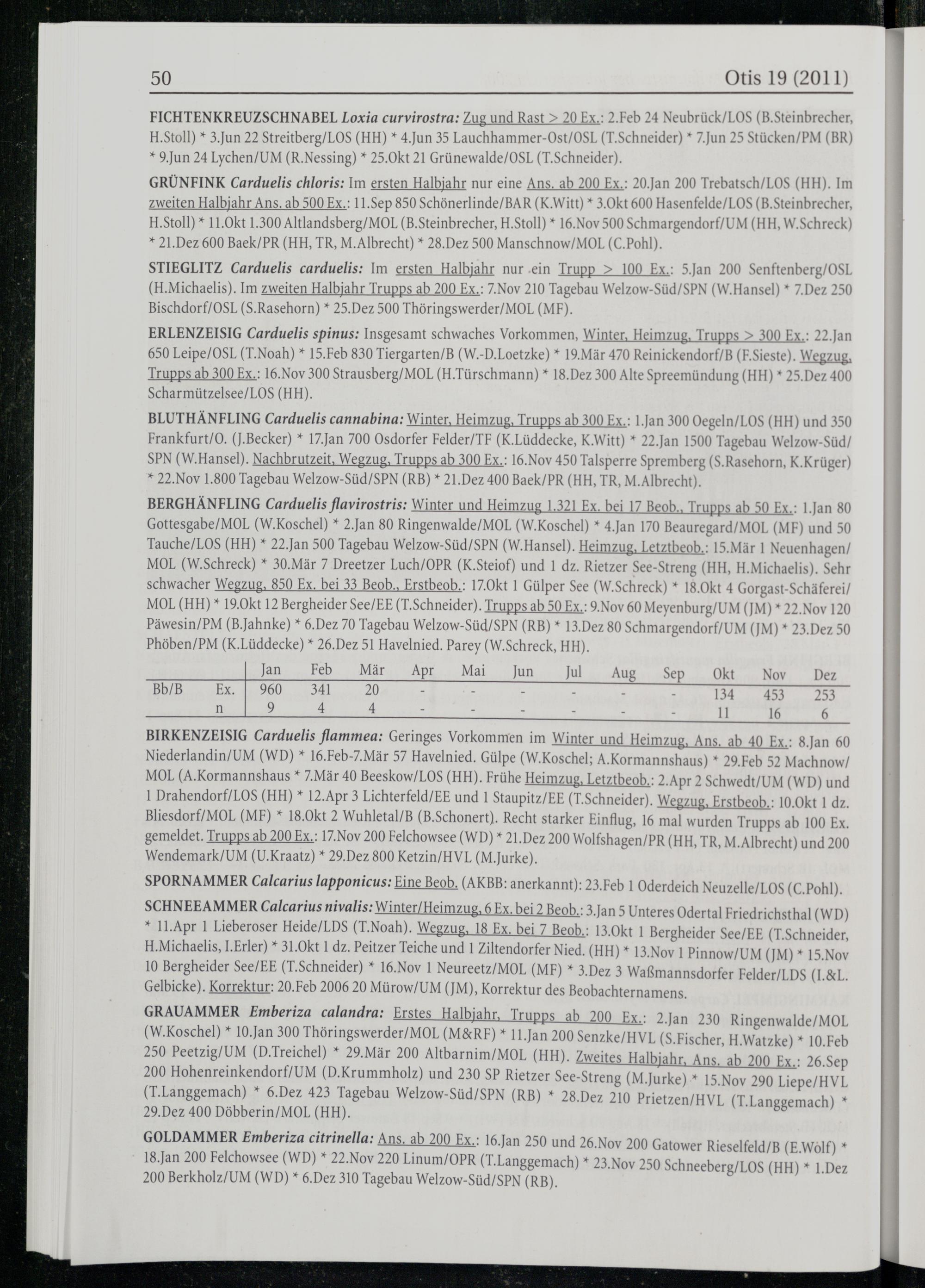 BERGHÄNFLING Carduelis flavirostris: Winter und Heimzug 1.321 Ex. bei 17 Beob., Trupps ab 50 Ex.: 1.Jan 80 Gottesgabe/MOL(W.Koschel)* 2.Jan 80 Ringenwalde/MOL(W.Koschel)* 4.Jan 170 Beauregard/MOL(MF) und 50 Tauche/LOS(HH)* 22.Jan 500 Tagebau Welzow-Süd/SPN (W.Hansel). Heimzug, Letztbeob.: 15.Mär 1 Neuenhagen / MOL(W.Schreck)* 30.Mär 7 Dreetzer Luch/OPR (K.Steiof) und 1 dz. Rietzer See-Streng(HH , H.Michaelis). Sehr schwacher Wegzug, 850 Ex. bei 33 Beob., Erstbeob.: 17.Okt 1 Gülper See(W.Schreck)* 18.Okt 4 Gorgast-Schäferei/ MOL(HH )* 19.Okt 12 Bergheider See/EE(T.Schneider). Trupps ab 50 Ex.: 9.Nov 60 Meyenburg/UM (JM)*22.Nov 120 Päwesin/PM (B.Jahnke)* 6.Dez 70 Tagebau Welzow-Süd/SPN (RB)* 13.Dez 80 Schmargendorf/UM (JM)* 23.Dez 50 Phöben/PM(K.Lüddecke)* 26.Dez 51 Havelnied. Parey (W.Schreck, HH ).
