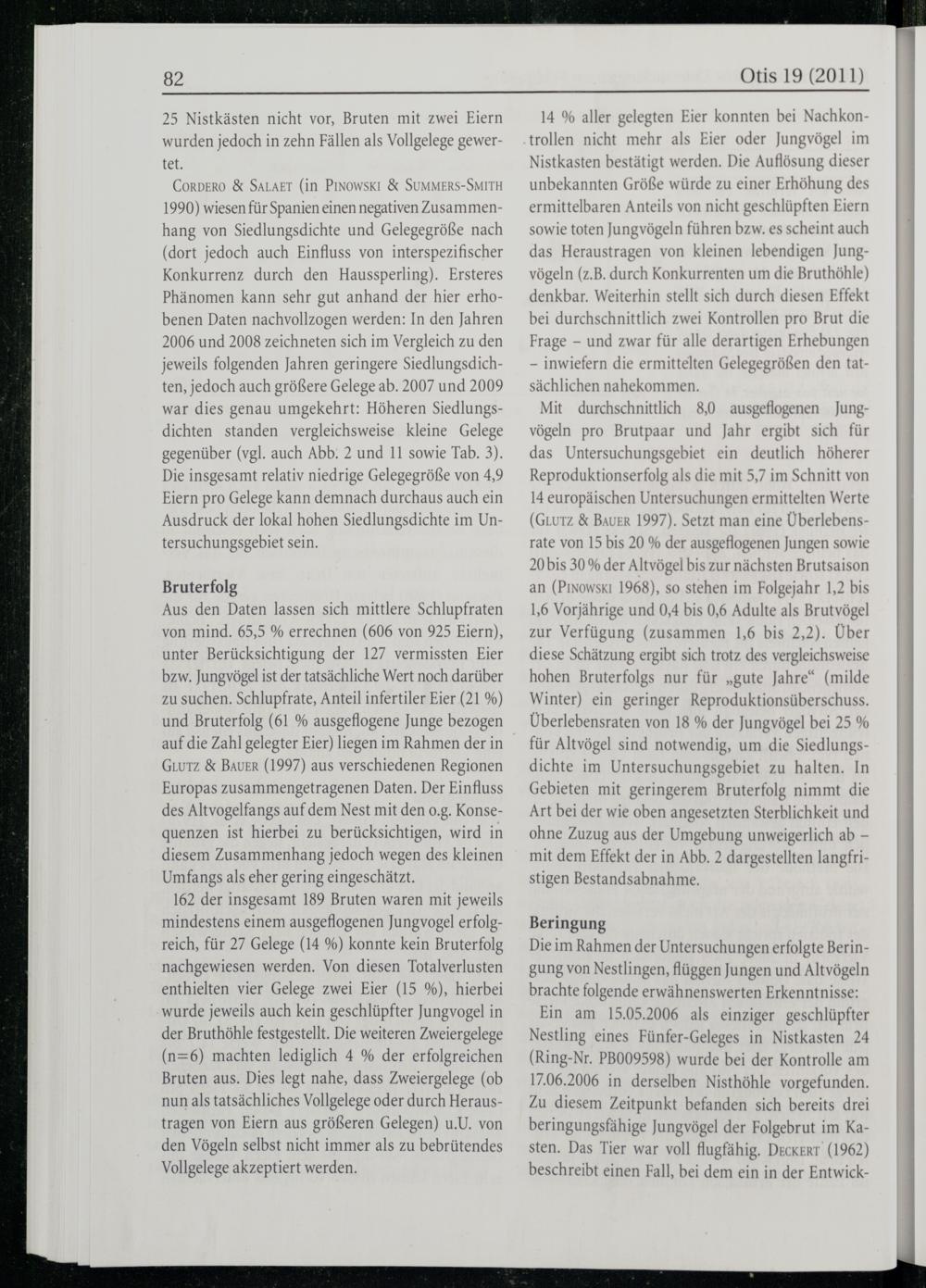 Aus den Daten lassen sich mittlere Schlupfraten von mind. 65,5% errechnen( 606 von 925 Eiern), unter Berücksichtigung der 127 vermissten Eier bzw. Jungvögel ist der tatsächliche Wert noch darüber zu suchen. Schlupfrate, Anteil infertiler Eier( 21%) und Bruterfolg( 61% ausgeflogene Junge bezogen auf die Zahl gelegter Eier) liegen im Rahmen der in GLUTZ& BAUER( 1997) aus verschiedenen Regionen Europas zusammengetragenen Daten. Der Einfluss des Altvogelfangs auf dem Nest mit den o.g. Konsequenzen ist hierbei zu berücksichtigen, wird in diesem Zusammenhang jedoch wegen des kleinen Umfangs als eher gering eingeschätzt.