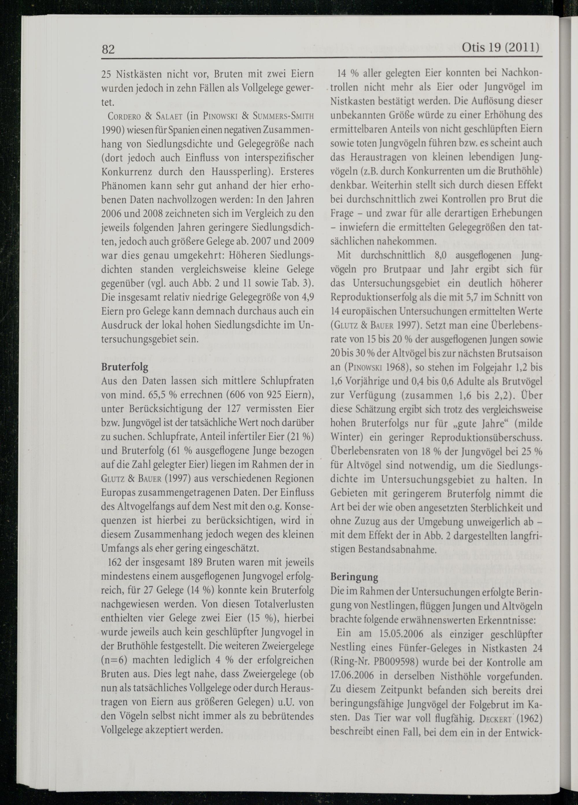 CORDERO& SALAET( in PINOWSKI& SUMMERS- SMITH 1990) wiesen für Spanien einen negativen Zusammenhang von Siedlungsdichte und Gelegegröße nach ( dort jedoch auch Einfluss von interspezifischer Konkurrenz durch den Haussperling). Ersteres Phänomen kann sehr gut anhand der hier erhobenen Daten nachvollzogen werden: In den Jahren 2006 und 2008 zeichneten sich im Vergleich zu den jeweils folgenden Jahren geringere Siedlungsdichten, jedoch auch größere Gelege ab. 2007 und 2009 war dies genau umgekehrt: Höheren Siedlungsdichten standen vergleichsweise kleine Gelege gegenüber( vgl. auch Abb. 2 und 11 sowie Tab. 3). Die insgesamt relativ niedrige Gelegegröße von 4,9 Eiern pro Gelege kann demnach durchaus auch ein Ausdruck der lokal hohen Siedlungsdichte im Untersuchungsgebiet sein.