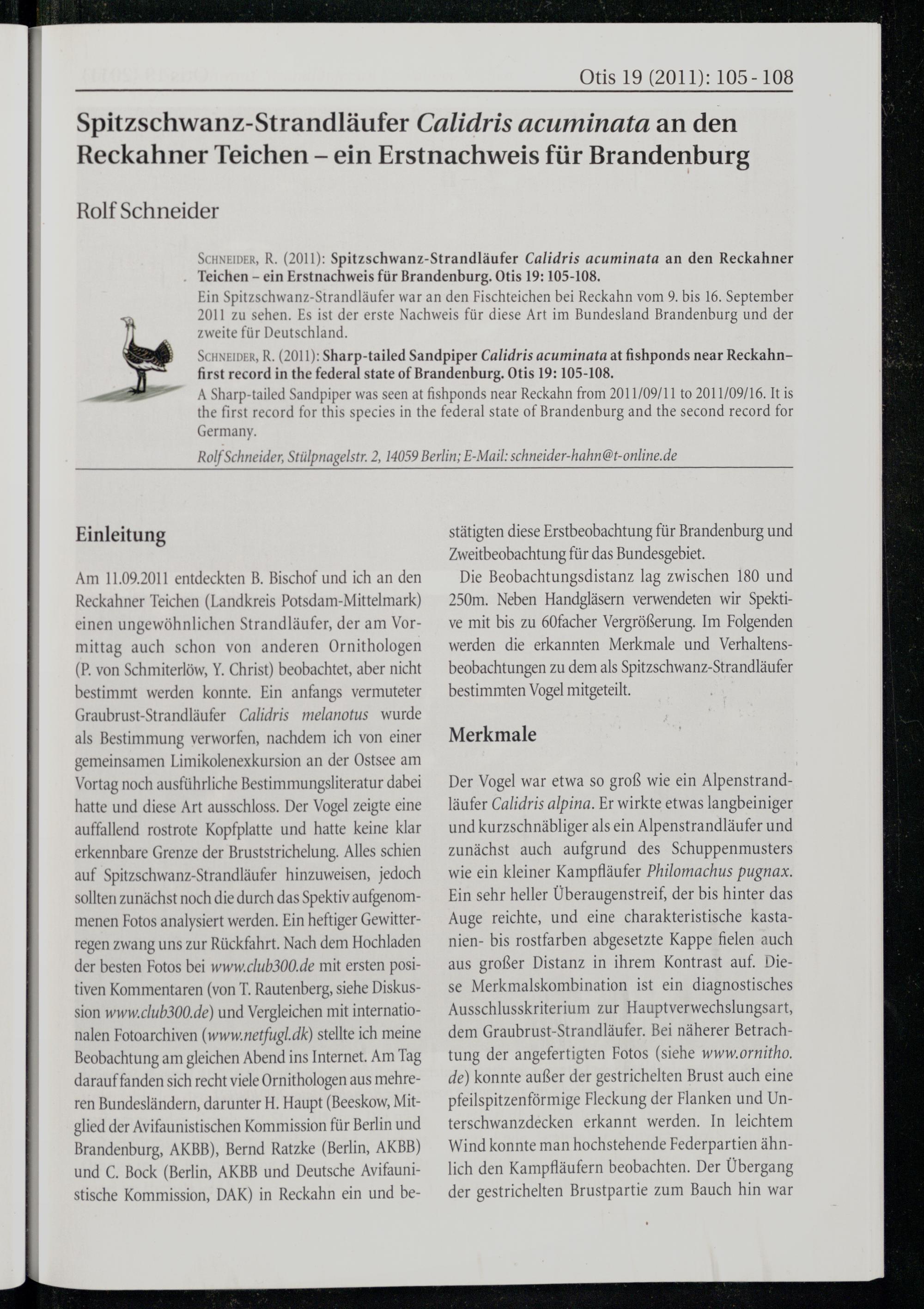 SCHNEIDER, R.(2011): Sharp-tailed Sandpiper Calidris acuminata at fishponds near Reckahnfirst record in the federal state of Brandenburg . Otis 19: 105-108,