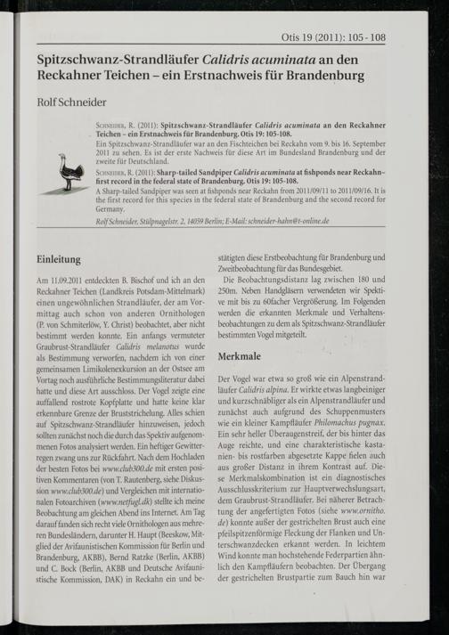 SCHNEIDER, R.(2011): Spitzschwanz-Strandläufer Calidris acuminata an den Reckahner Teichen- ein Erstnachweis für Brandenburg . Otis 19: 105-108.