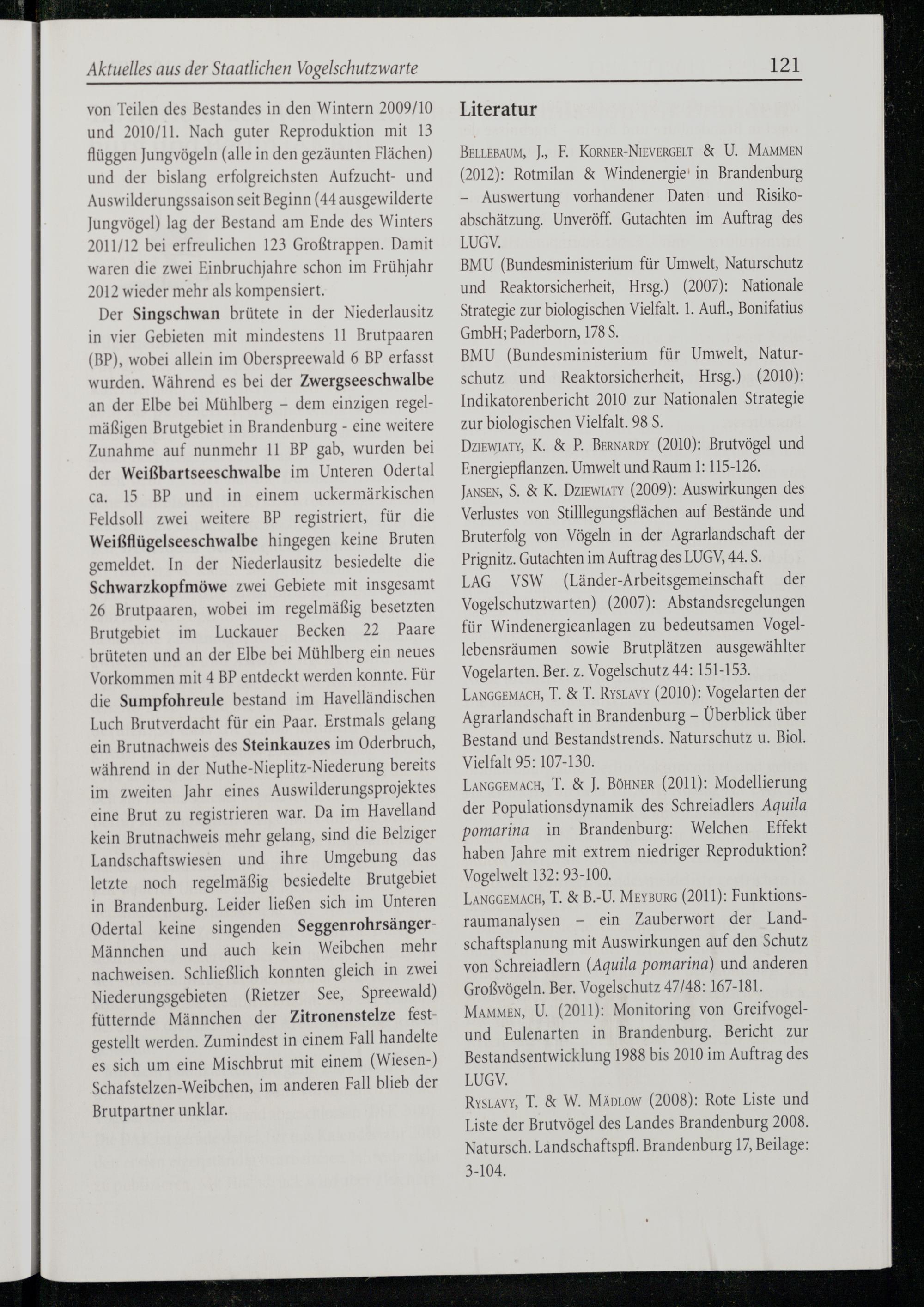 DzıewiaTY, K.& P. BErnarDy(2010): Brutvögel und Energiepflanzen. Umwelt und Raum 1: 115-126. Jansen, S.& K. Dzıewiary(2009): Auswirkungen des Verlustes von Stilllegungsflächen auf Bestände und Bruterfolg von Vögeln in der Agrarlandschaft der Prignitz . Gutachten im Auftrag des LUGV, 44. 5.