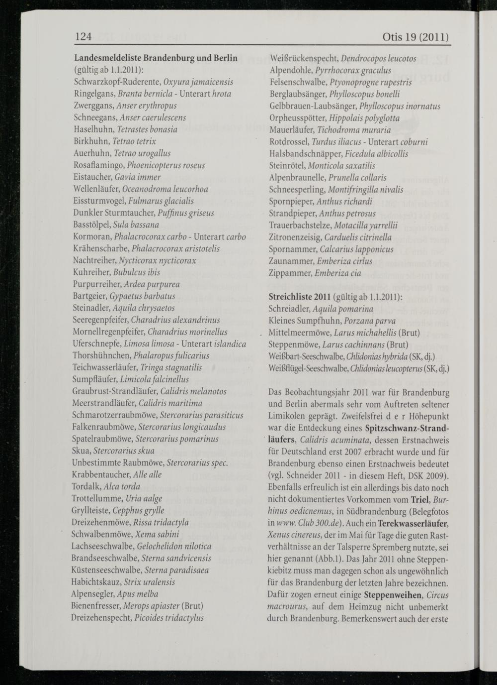 Das Beobachtungsjahr 2011 war für Brandenburg und Berlin abermals sehr vom Auftreten seltener Limikolen geprägt. Zweifelsfrei d e r Höhepunkt war die Entdeckung eines Spitzschwanz-Strandläufers, Calidris acuminata, dessen Erstnachweis für Deutschland erst 2007 erbracht wurde und für Brandenburg ebenso einen Erstnachweis bedeutet (vgl. Schneider 2011- in diesem Heft, DSK 2009). Ebenfalls erfreulich ist ein allerdings bis dato noch nicht dokumentiertes Vorkommen vom Triel, Burhinus oedicnemus, in Südbrandenburg(Belegfotos in www. Club 300.de). Auch ein Terekwasserläufer, Xenus cinereus, der im Mai für Tage die guten Rastverhältnisse an der Talsperre Spremberg nutzte, sei hier genannt(Abb.1). Das Jahr 2011 ohne Steppenkiebitz muss man dagegen schon als ungewöhnlich für das Brandenburg der letzten Jahre bezeichnen. Dafür zogen erneut einige Steppenweihen, Circus macrourus, auf dem Heimzug nicht unbemerkt durch Brandenburg . Bemerkenswert auch der erste