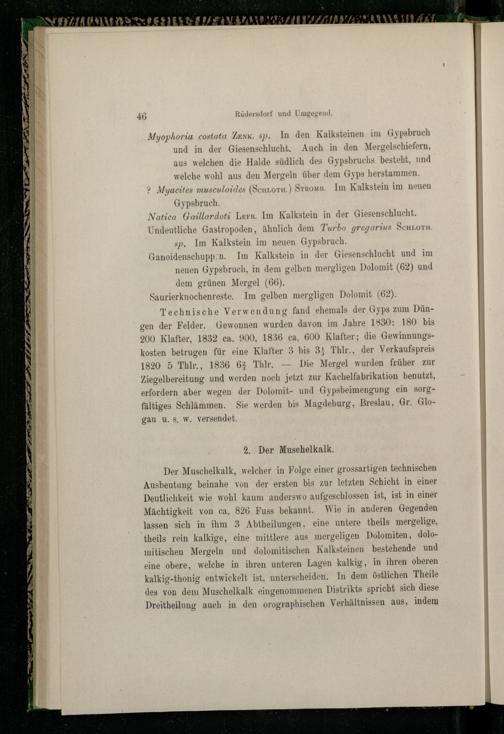 Myophoria costata ZexK. sp. In den Kalksteinen im Gypsbruch und in der Giesenschlucht. Auch in den Mergelschiefern, aus welchen die Halde südlich des Gypsbruchs besteht, und welche wohl aus den Mergeln über dem Gyps herstammen,