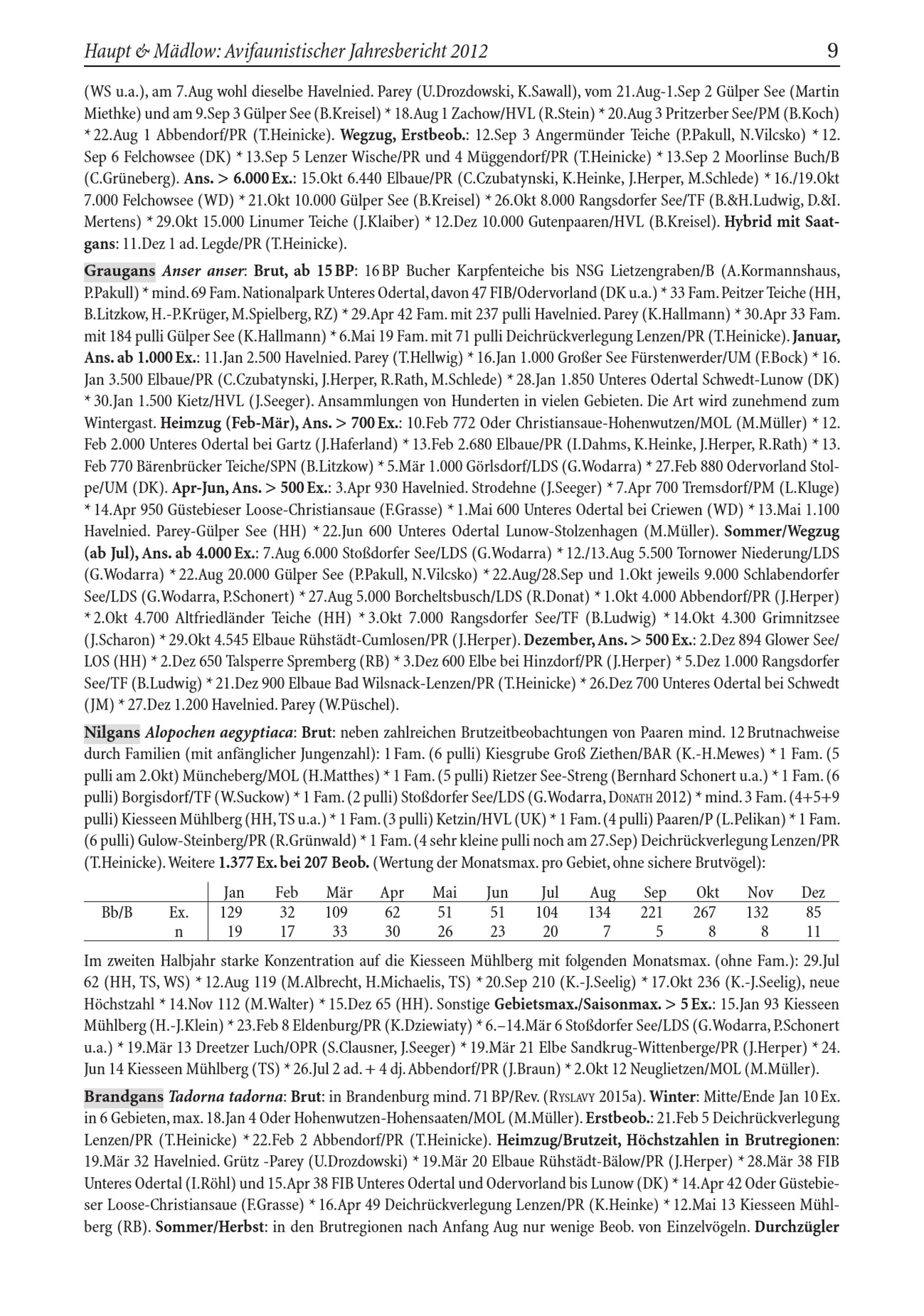 Graugans Anser anser : Brut, ab 15 BP: 16 BP Bucher Karpfenteiche bis NSG Lietzengraben/ B( A.Kormannshaus, P.Pakull)* mind. 69 Fam. Nationalpark Unteres Odertal , davon 47 FIB/ Odervorland ( DK u.a.)* 33 Fam. Peitzer Teiche( HH , B.Litzkow, H.- P.Krüger, M.Spielberg, RZ)* 29.Apr 42 Fam. mit 237 pulli Havelnied. Parey ( K.Hallmann)* 30.Apr 33 Fam. mit 184 pulli Gülper See( K.Hallmann)* 6.Mai 19 Fam. mit 71 pulli Deichrückverlegung Lenzen/ PR( T.Heinicke). Januar, Ans. ab 1.000 Ex.: 11.Jan 2.500 Havelnied. Parey ( T.Hellwig)* 16.Jan 1.000 Großer See Fürstenwerder/ UM( F.Bock)* 16. Jan 3.500 Elbaue/ PR( C.Czubatynski, J.Herper, R.Rath, M.Schlede)* 28.Jan 1.850 Unteres Odertal Schwedt- Lunow( DK) * 30.Jan 1.500 Kietz/ HVL ( J.Seeger). Ansammlungen von Hunderten in vielen Gebieten. Die Art wird zunehmend zum Wintergast. Heimzug( Feb- Mär), Ans.> 700 Ex.: 10.Feb 772 Oder Christiansaue- Hohenwutzen/ MOL( M.Müller)* 12. Feb 2.000 Unteres Odertal bei Gartz ( J.Haferland)* 13.Feb 2.680 Elbaue/ PR( I.Dahms, K.Heinke, J.Herper, R.Rath)* 13. Feb 770 Bärenbrücker Teiche/ SPN ( B.Litzkow)* 5.Mär 1.000 Görlsdorf/ LDS ( G.Wodarra)* 27.Feb 880 Odervorland Stolpe/ UM( DK). Apr- Jun, Ans.> 500 Ex.: 3.Apr 930 Havelnied. Strodehne ( J.Seeger)* 7.Apr 700 Tremsdorf/ PM( L.Kluge) * 14.Apr 950 Güstebieser Loose- Christiansaue( F.Grasse)* 1.Mai 600 Unteres Odertal bei Criewen ( WD)* 13.Mai 1.100 Havelnied. Parey - Gülper See( HH )* 22.Jun 600 Unteres Odertal Lunow- Stolzenhagen( M.Müller). Sommer/ Wegzug ( ab Jul), Ans. ab 4.000 Ex.: 7.Aug 6.000 Stoßdorfer See/ LDS ( G.Wodarra)* 12./13.Aug 5.500 Tornower Niederung/ LDS ( G.Wodarra)* 22.Aug 20.000 Gülper See( P.Pakull, N.Vilcsko)* 22.Aug/ 28.Sep und 1.Okt jeweils 9.000 Schlabendorfer See/ LDS ( G.Wodarra, P.Schonert)* 27.Aug 5.000 Borcheltsbusch/ LDS ( R.Donat)* 1.Okt 4.000 Abbendorf/ PR( J.Herper) * 2.Okt 4.700 Altfriedländer Teiche( HH )* 3.Okt 7.000 Rangsdorfer See/ TF( B.Ludwig)* 14.Okt 4.300 Grimnitzsee ( J.Scharon)* 29.Okt 4.545 Elbaue Rühstädt - Cumlosen / PR( J.Herper). Dezember, Ans.> 500 Ex.: 2.Dez 894 Glower See/ LOS( HH )* 2.Dez 650 Talsperre Spremberg ( RB)* 3.Dez 600 Elbe bei Hinzdorf/ PR( J.Herper)* 5.Dez 1.000 Rangsdorfer See/ TF( B.Ludwig)* 21.Dez 900 Elbaue Bad Wilsnack- Lenzen/ PR( T.Heinicke)* 26.Dez 700 Unteres Odertal bei Schwedt ( JM)* 27.Dez 1.200 Havelnied. Parey ( W.Püschel).