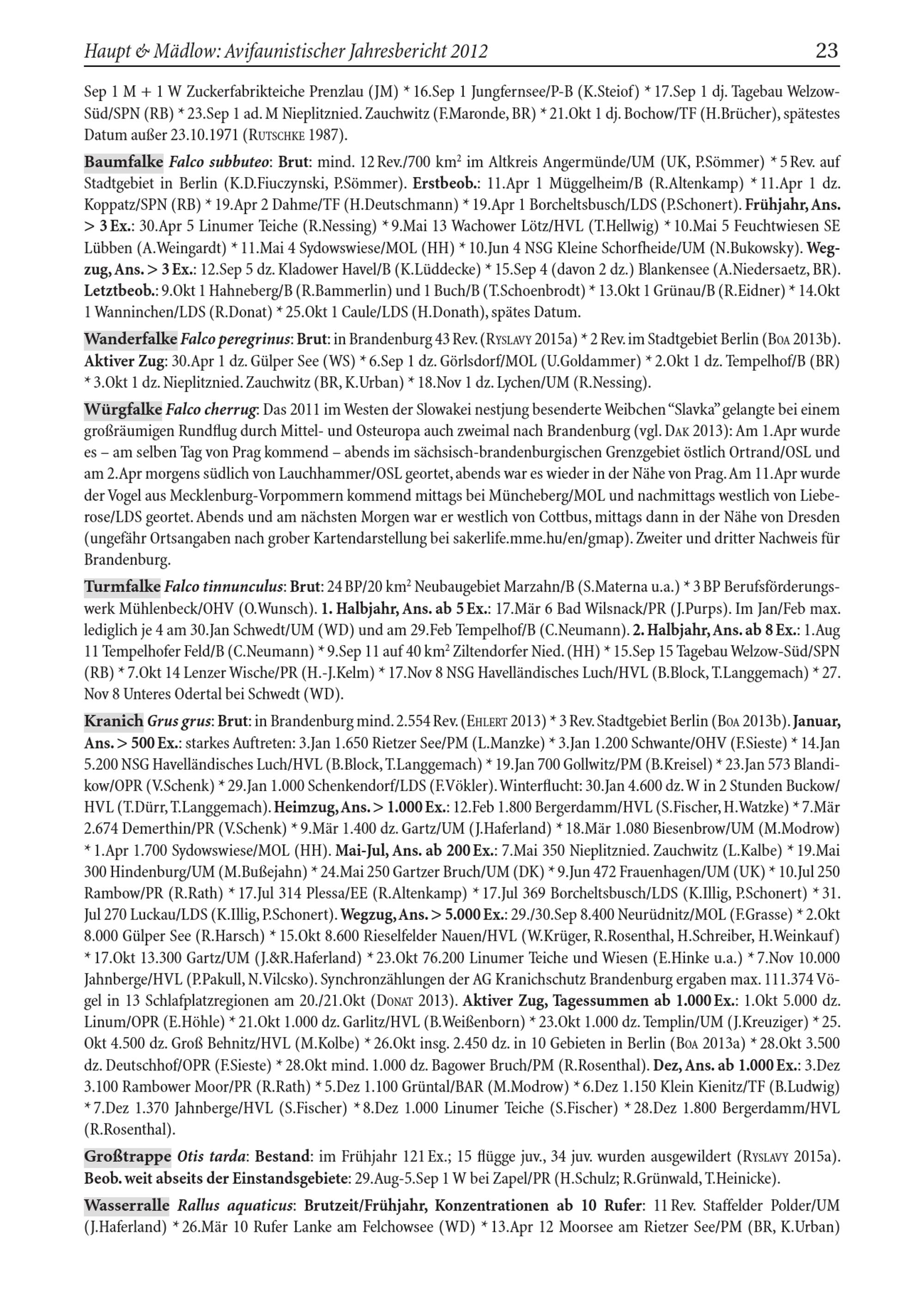 Kranich Grus grus: Brut: in Brandenburg mind. 2.554 Rev.( EHLERT 2013)* 3 Rev. Stadtgebiet Berlin( BOA 2013b). Januar, Ans.> 500 Ex.: starkes Auftreten: 3.Jan 1.650 Rietzer See/ PM( L.Manzke)* 3.Jan 1.200 Schwante/ OHV ( F.Sieste)* 14.Jan 5.200 NSG Havelländisches Luch/ HVL ( B.Block, T.Langgemach)* 19.Jan 700 Gollwitz/ PM( B.Kreisel)* 23. Jan 573 Blandikow/ OPR ( V.Schenk)* 29.Jan 1.000 Schenkendorf/ LDS ( F.Vökler). Winterflucht: 30.Jan 4.600 dz. W in 2 Stunden Buckow/ HVL ( T.Dürr, T.Langgemach). Heimzug, Ans.> 1.000 Ex.: 12.Feb 1.800 Bergerdamm/ HVL ( S.Fischer , H. Watzke)* 7.Mär 2.674 Demerthin/ PR( V.Schenk)* 9.Mär 1.400 dz. Gartz / UM( J.Haferland)* 18.Mär 1.080 Biesenbrow / UM( M.Modrow) * 1.Apr 1.700 Sydowswiese/ MOL( HH ). Mai- Jul, Ans. ab 200 Ex.: 7.Mai 350 Nieplitznied. Zauchwitz ( L.Kalbe)* 19.Mai 300 Hindenburg/ UM( M.Buẞejahn)* 24.Mai 250 Gartzer Bruch/ UM( DK)* 9.Jun 472 Frauenhagen/ UM( UK )* 10.Jul 250 Rambow/ PR( R.Rath)* 17.Jul 314 Plessa / EE( R.Altenkamp)* 17.Jul 369 Borcheltsbusch/ LDS ( K.Illig, P.Schonert)* 31. Jul 270 Luckau / LDS ( K.Illig, P.Schonert). Wegzug, Ans.> 5.000 Ex.: 29./30.Sep 8.400 Neurüdnitz/ MOL( F.Grasse)* 2.Okt 8.000 Gülper See( R.Harsch)* 15.Okt 8.600 Rieselfelder Nauen / HVL ( W.Krüger, R.Rosenthal, H.Schreiber, H. Weinkauf) * 17.Okt 13.300 Gartz / UM( J.& R.Haferland)* 23.Okt 76.200 Linumer Teiche und Wiesen( E.Hinke u.a.)* 7.Nov 10.000 Jahnberge/ HVL ( P.Pakull, N.Vilcsko). Synchronzählungen der AG Kranichschutz Brandenburg ergaben max. 111.374 Vögel in 13 Schlafplatzregionen am 20./21.Okt( DONAT 2013). Aktiver Zug, Tagessummen ab 1.000 Ex.: 1.Okt 5.000 dz. Linum / OPR ( E.Höhle)* 21.Okt 1.000 dz. Garlitz / HVL ( B.Weißenborn)* 23.Okt 1.000 dz. Templin / UM( J.Kreuziger)* 25. Okt 4.500 dz. Groß Behnitz/ HVL ( M.Kolbe)* 26.Okt insg. 2.450 dz. in 10 Gebieten in Berlin ( BOA 2013a)* 28.Okt 3.500 dz. Deutschhof/ OPR ( F.Sieste)* 28.Okt mind. 1.000 dz. Bagower Bruch/ PM( R.Rosenthal). Dez, Ans. ab 1.000 Ex.: 3.Dez 3.100 Rambower Moor/ PR( R.Rath)* 5.Dez 1.100 Grüntal/ BAR( M.Modrow)* 6.Dez 1.150 Klein Kienitz/ TF( B.Ludwig) * 7.Dez 1.370 Jahnberge/ HVL ( S.Fischer )* 8.Dez 1.000 Linumer Teiche( S.Fischer )* 28.Dez 1.800 Bergerdamm/ HVL ( R.Rosenthal).